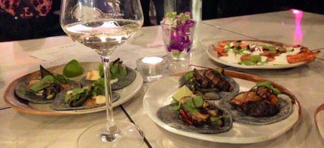 Back to West Wine, alongside a couple of glasses of very light white wine (emphasis added – the tones were mellow, borderline diluted), my companion and I ordered a selection of small plates and tacos to share (£8 each). The tacos were probably the highlight of the evening for me: one with halloumi, and another with artichoke, both sitting atop of a wonderfully bite-sized blue corn tortilla. Fun and fresh, tacos always bring a smile to my face, especially when their made with 100% blue corn flour. Each could probably have done with a creamy note, though, whether in the form of avocado or otherwise.