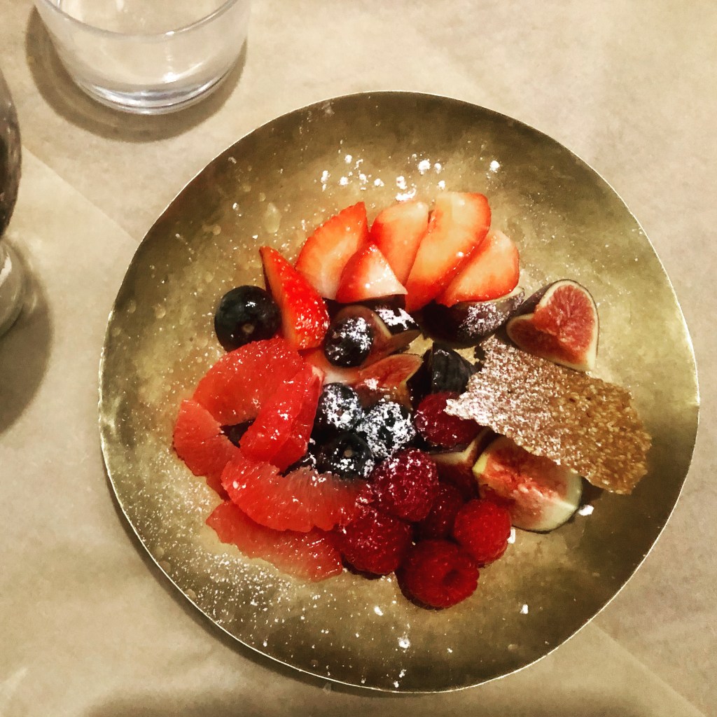 The staff here, as mentioned, are a charismatic bunch: they explain and enthuse about the dishes and make you feel at home. Though we were too full for afters, we were presented with a bowl of berries and moreishly sweet sesame seed tuiles: a perfect palette cleanser, making the most of the last of summer produce. This reminded me of the Palamor or Machneyuda, where the chefs are downing shots with their diners on a regular basis!