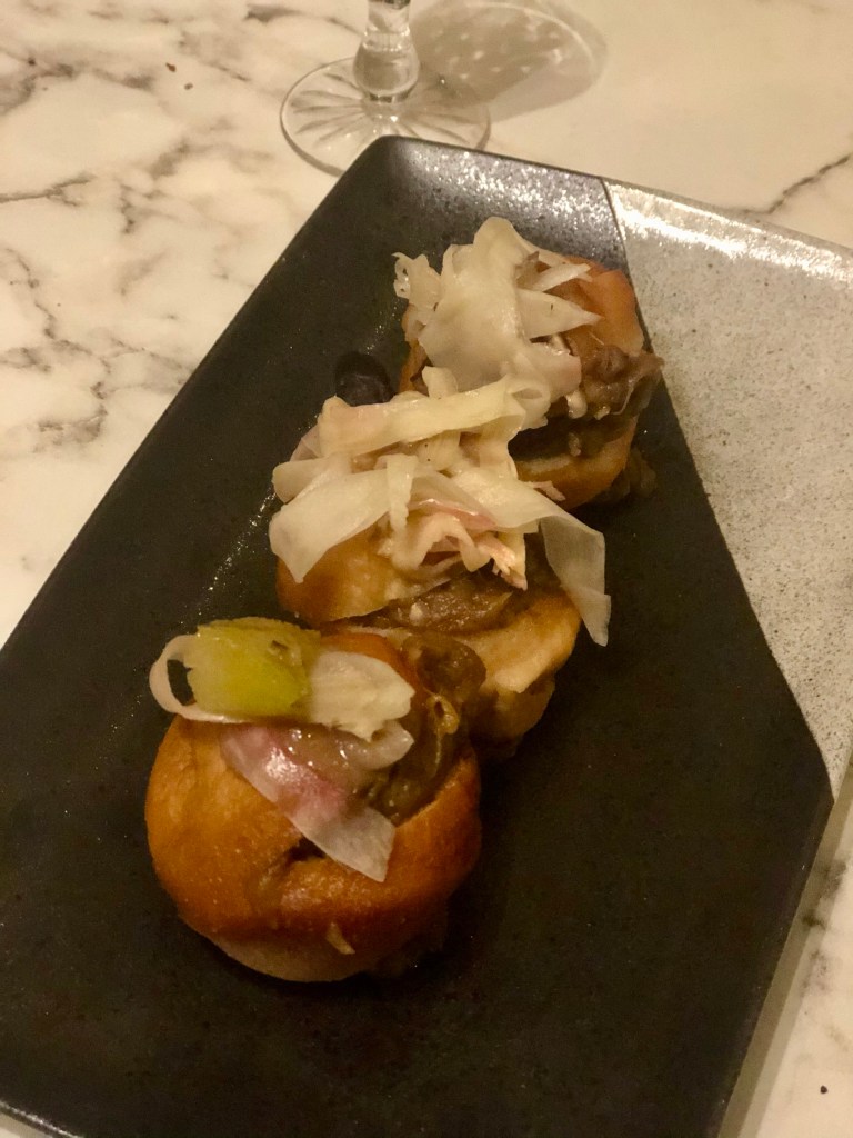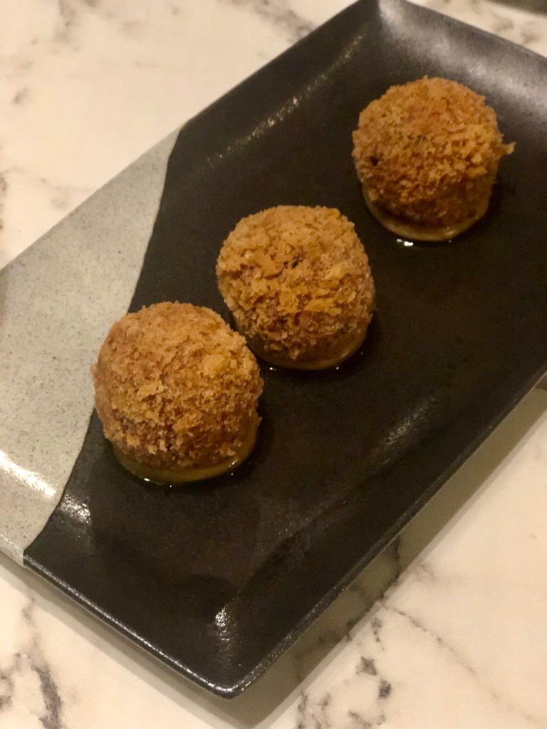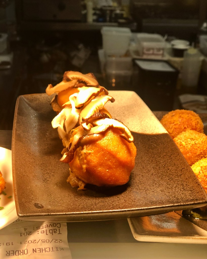 A last minute order of intrigue – given we had no idea what to expect from the dish – was the smoked miso aubergine doughnuts with house pickles & shiitake lime jus (£7). A vegan delight, it was both sweet yet savoury, occupying that third flavour ground loaded with umami. An unexpected triumph. Quite literally doughnuts filled with pureed aubergine, the pickles above provided a sour counterpoint and the shitake mushroom jus another dip to maximise flavour. Ever so moreish, the plate was a good finisher for the meal: sweet and light.