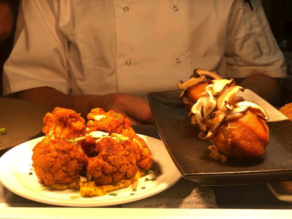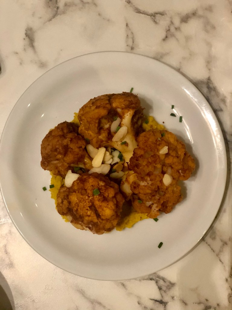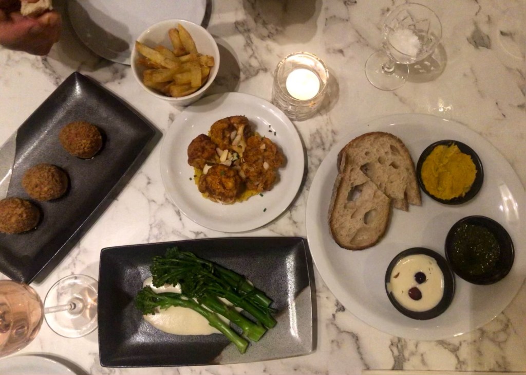 Like its offshoots, the menu is split into snacks and nibbles and small plates, with a strong “Veg” section. To open, we went for the “Breads n spreads” which comes with a trio of dips: turmeric hummus, basil pesto and ajoblanco (£8). This order was a no brainer for a top wine bar, another nod to the spirit of a Spanish tapas joint or Parisian wine bar, and was enjoyed alongside the Italian rose prosecco offered to all diners to mark their opening (and also the late-running service!). Neither the bread nor the dips disappointed. The sourdough was light, fresh and dotted with bubbles of air, characteristics of a good, just-out-the-oven dough and was the perfect vehicle for the ajoblanco: a creamy almond-garlic Spanish-style dip dotted with olives. All my favourite ingredients in a dip! We found ourselves returning to enjoy what was left of the dips with each of our small plates, uniting the meal in an unexpected way. This small plate also represented what for me at least good cooking is all about: flavour, which is so important for veggie / vegan cooking.