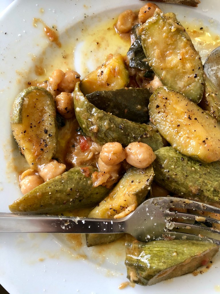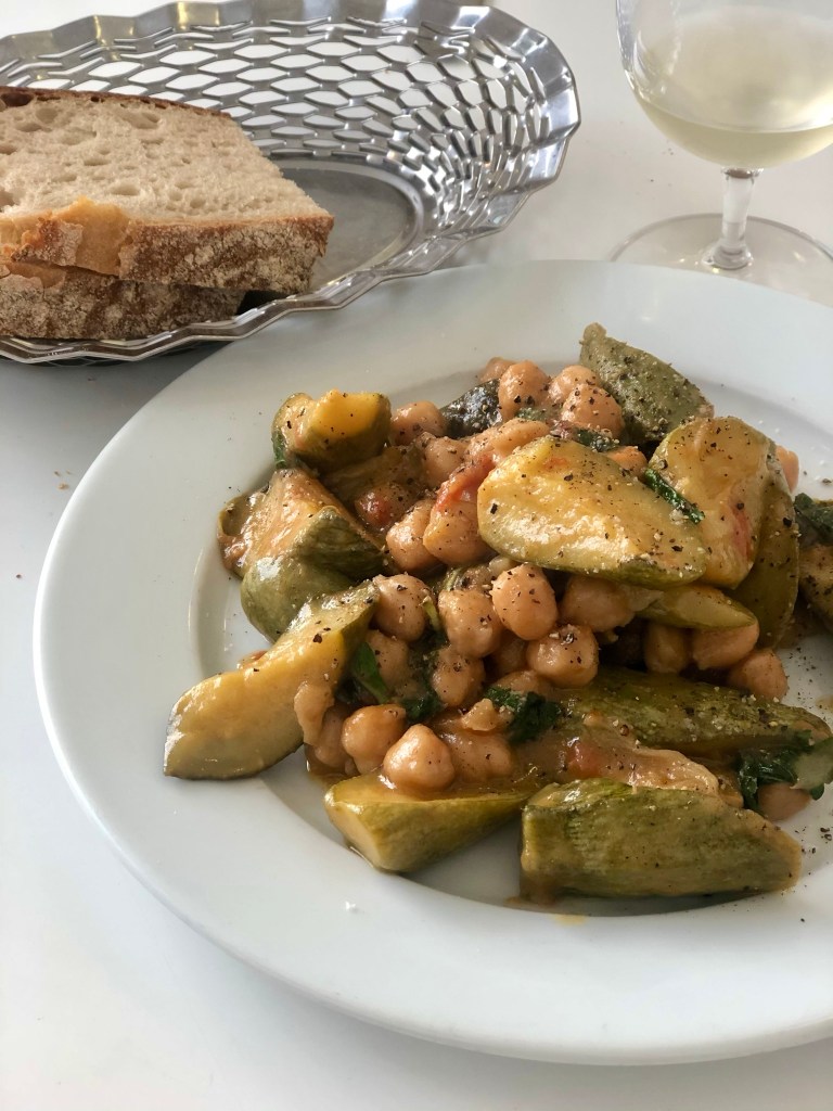 For mains, more pulses – this time chickpeas cooked in tomatoes, alongside braised courgettes. This was another example of cooking touched by a quiet, calming cleverness. The two ingredients were artfully cultivated and a modest nod to the tomato fortnight celebrations at the moment.