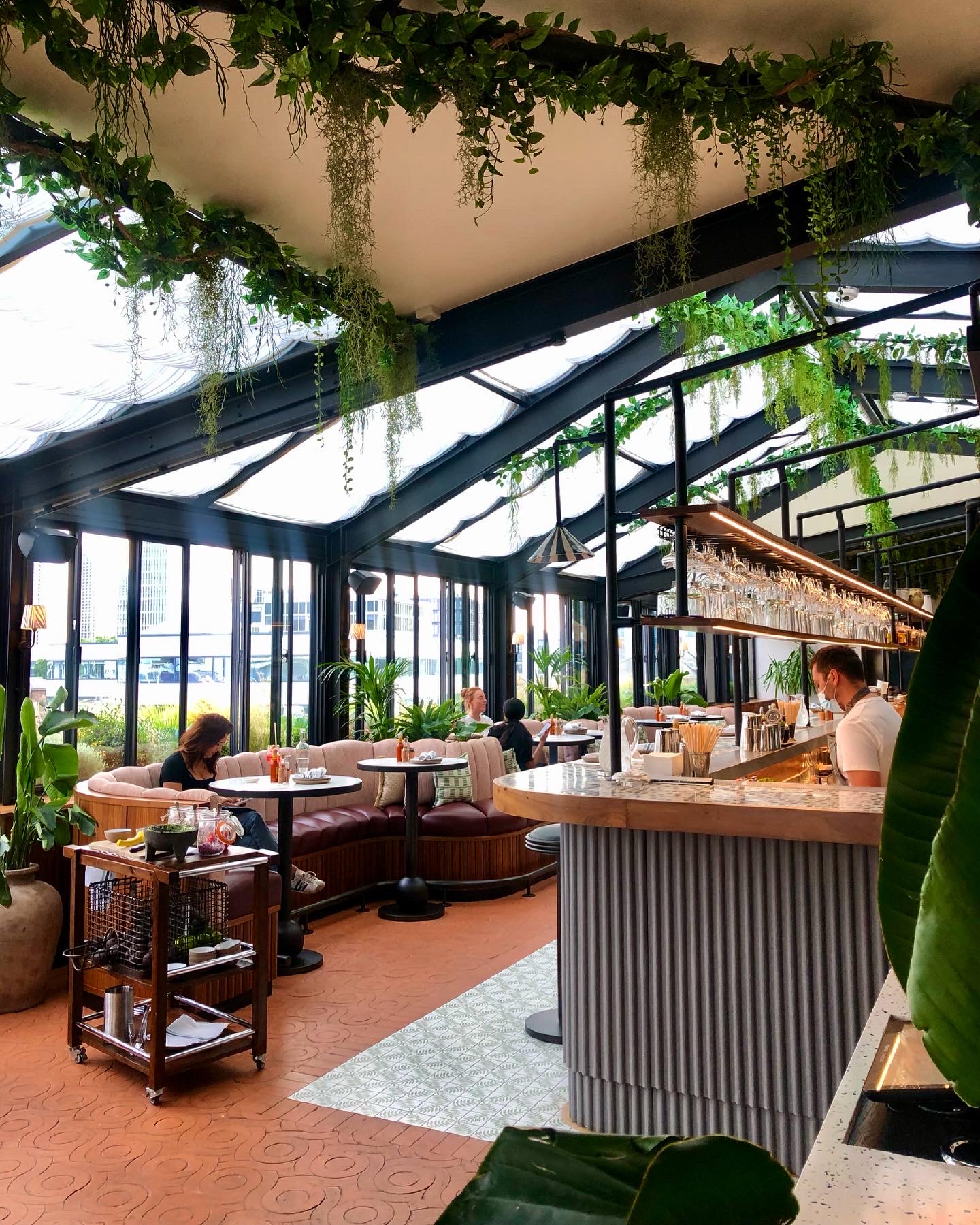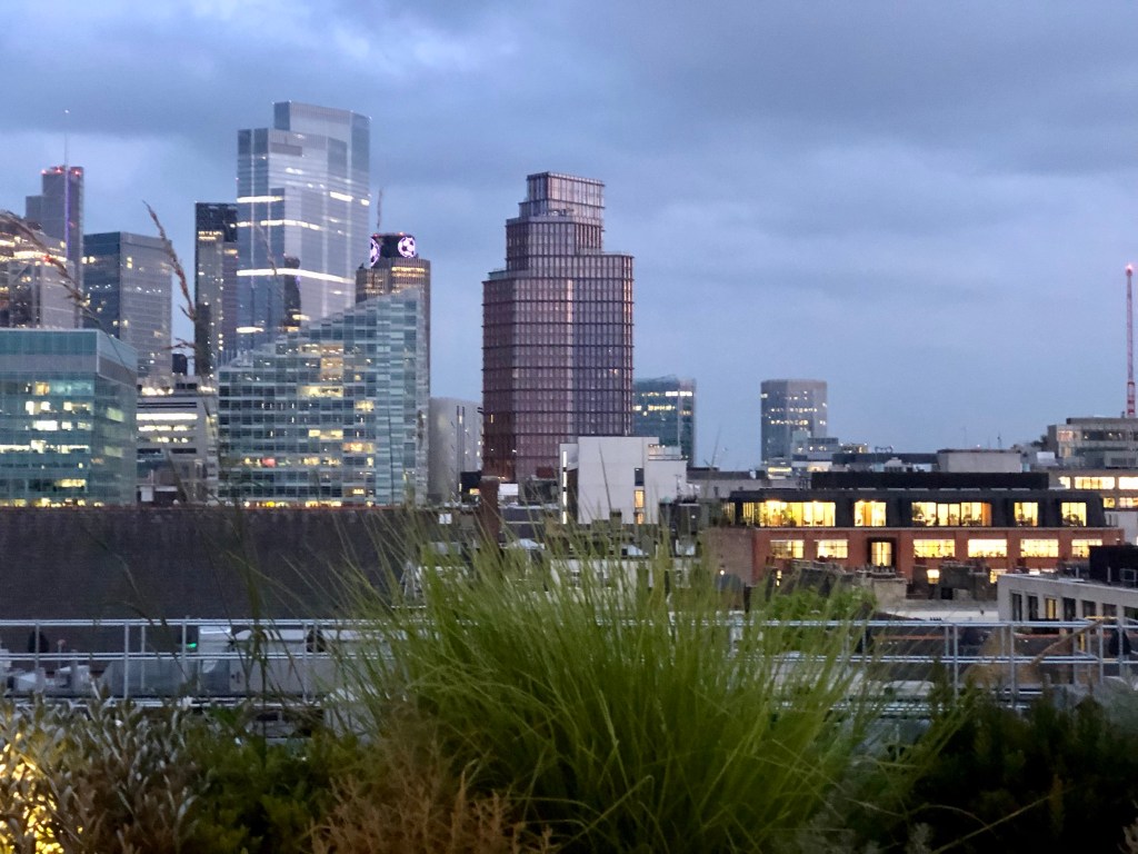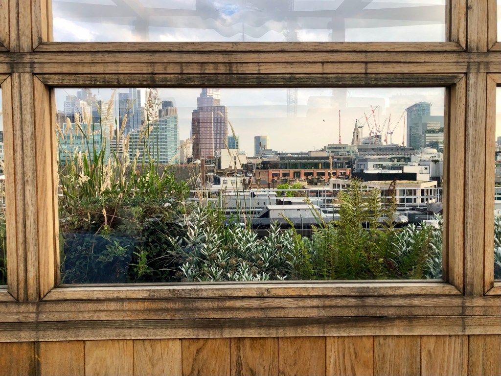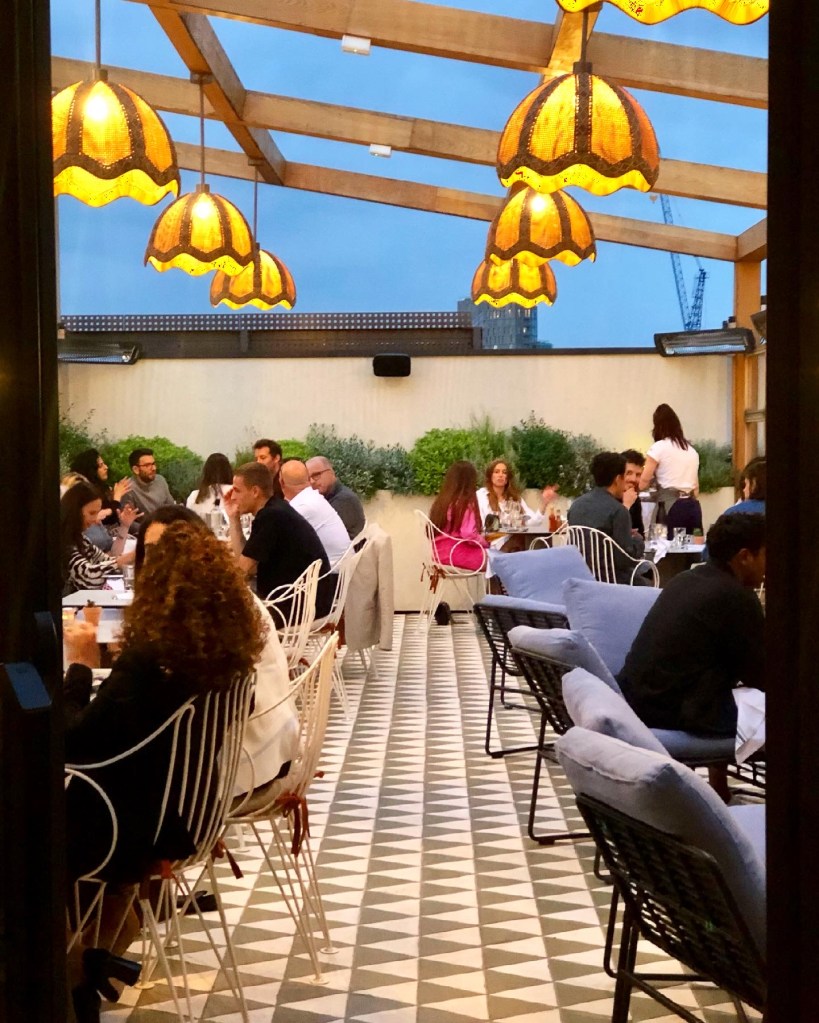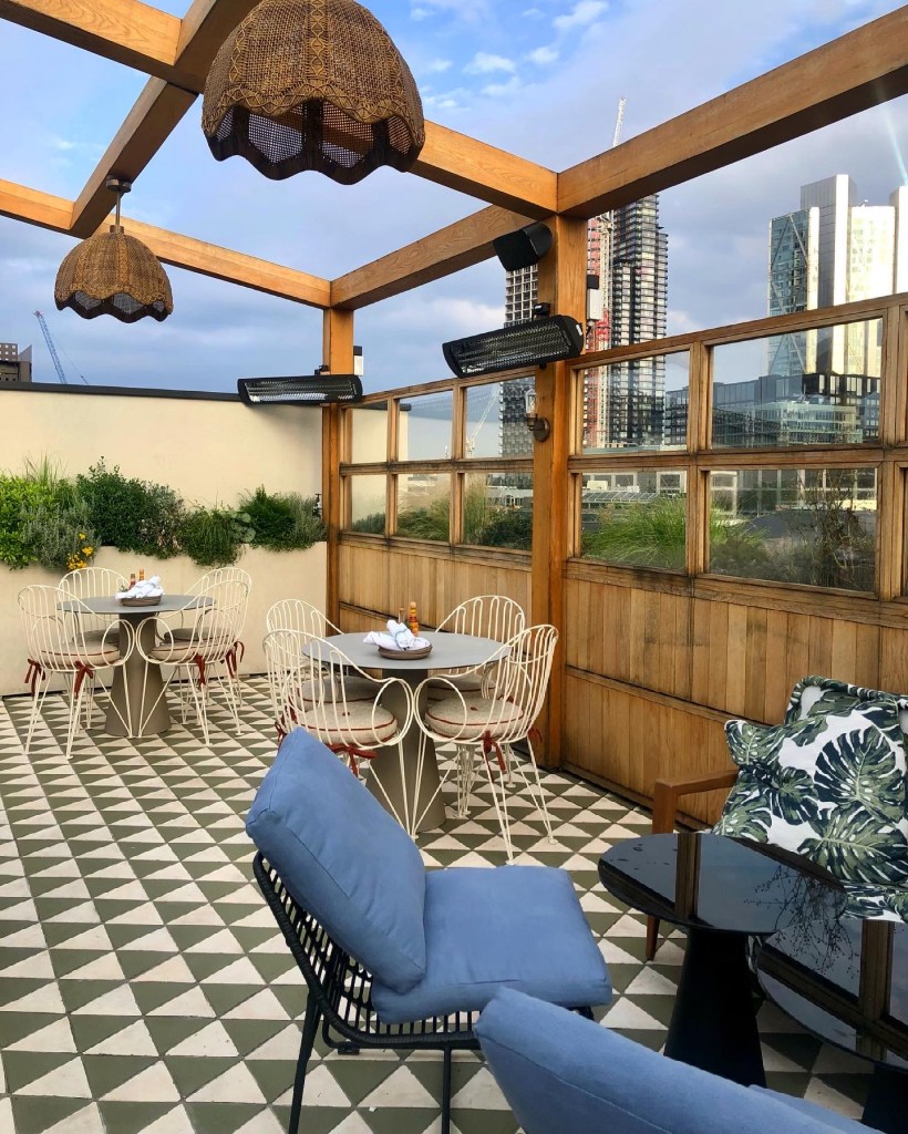 On a sunny evening, the outdoor terrace feels like a hidden place to be – the entrance is tucked away behind Great Eastern Street through a discrete green door with a great big handle. Requiring navigation to the 7th-floor rooftop, once you’ve made it up the view and décor at the top is worth it: bohemian greenery outside breaks up the industrial-styled setting on the outdoor terrace. The inside is equally attractive, encased by a glass structure with a concrete and terrazzo bar and a mix of low-level lounge seating, booths and dining tables.
