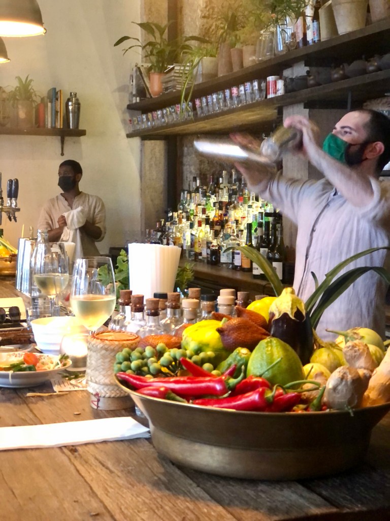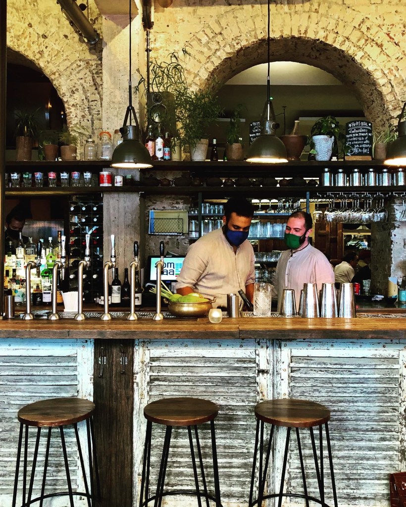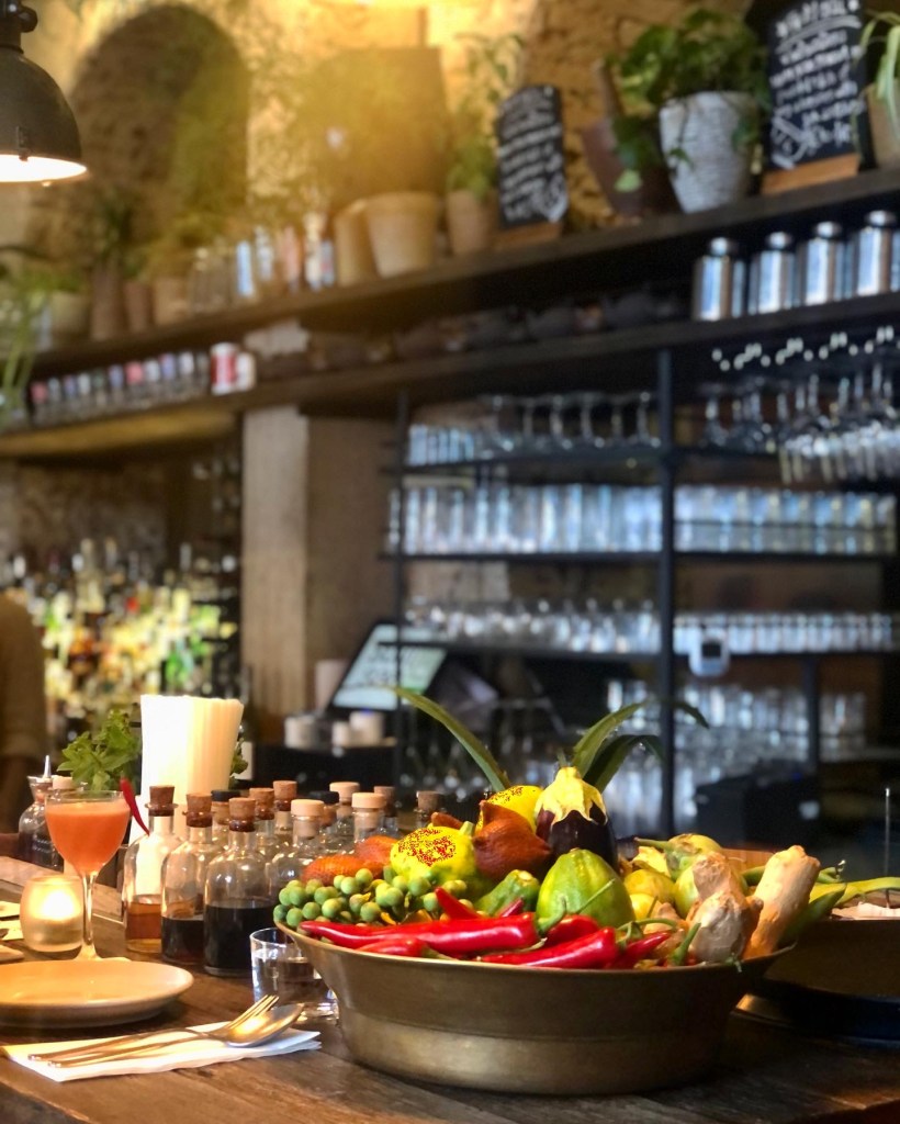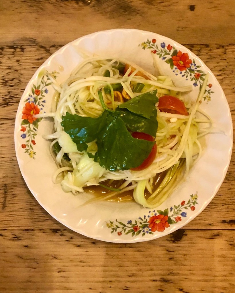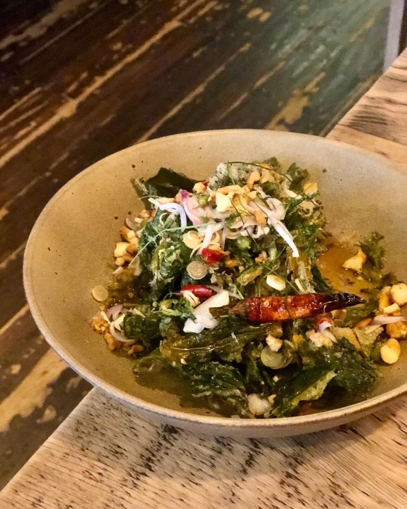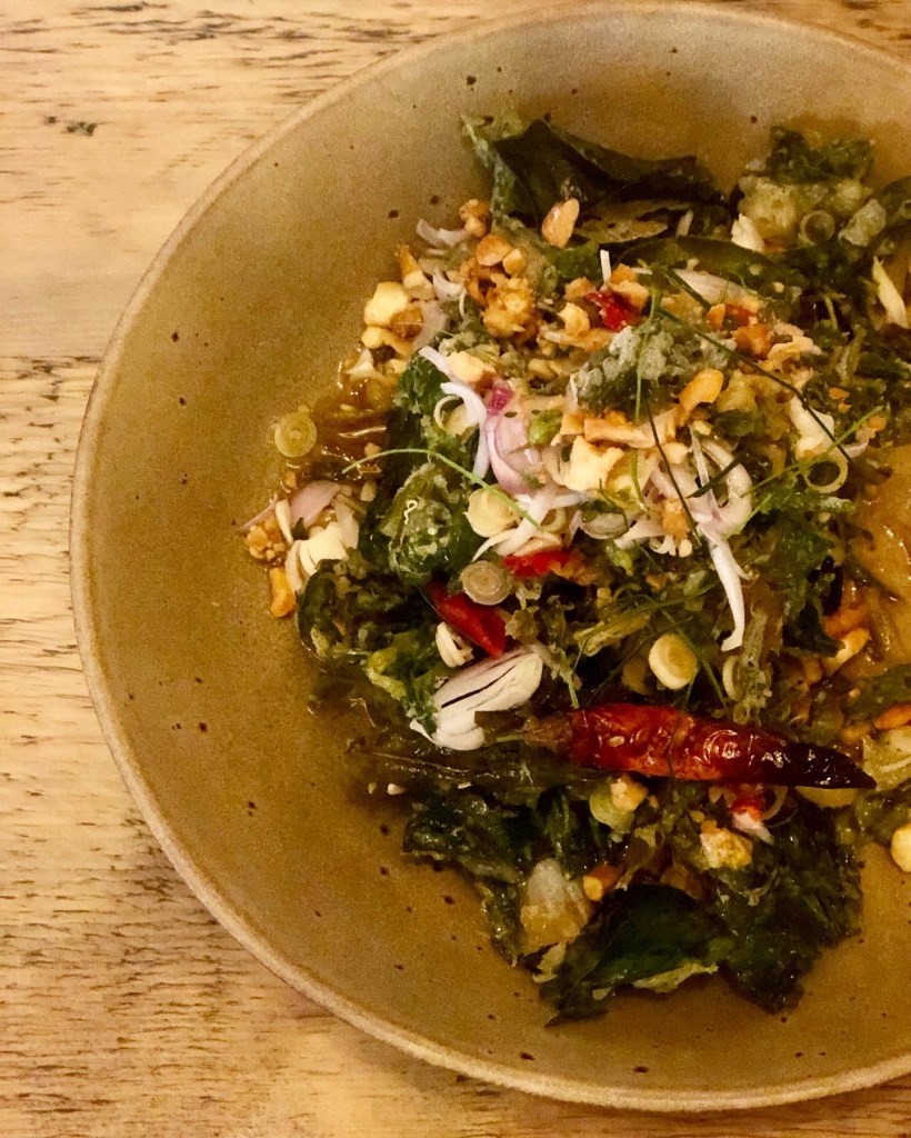 Located in a former fabrics warehouse just south of Spitalfields Market, the interiors are moody and exotic. The front bar is bright and airy, whilst out back is a more dimly lit and “cool” dining area, with a factory-like vibe in keeping with Som Saa’s pop-up heritage. The semi-open kitchen that can be seen through the wooden panels in the dining area leaves you eager to get your orders going in and your plates coming out. And even if you sit in the brighter front area, as my companion and I did on our visit, the smells wafting out of the kitchen and the sight of spices and chillis along the bar leave your mouth-watering.