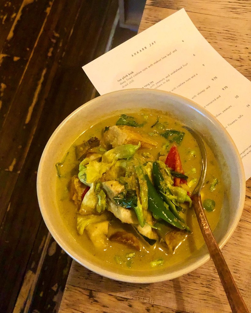 Finally, we shared the Gaeng Khiao Waan Jay, because no Thai meal is complete without a green curry. But Som Saa’s take on this classic dish is a far step away from your usual green curry. Featuring green banana, kajorn flowers and spongy tofu, the bowl also featured pea aubergine – a very small pea-resembling aubergine – which was a total revelation for me. Probably the most effective element of this curry, though, is the sauce which lends the whole bowl a soothing sweet depth. Made from their own coconut cream, its oozing with ethereal wafts of Thai basil, lemongrass and coriander.
