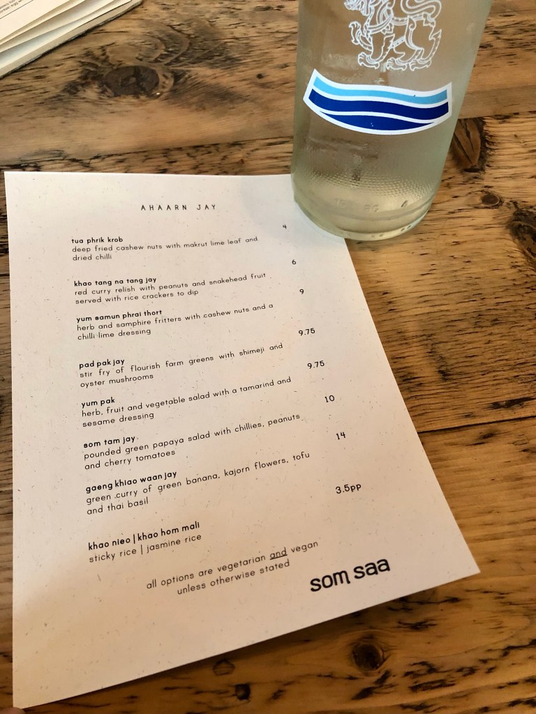 By a stroke of luck, Som Saa had Saturday night availability for two, at a reasonable hour – 7.45pm – just two days before booking. I say “luck” as Som Saa is a Thai restaurant in demand. What started life as a pop-up in Climpson Arch’s and at the Begging Bowl in Peckham, it now has a permenant home on Union Street, which like all its manifestations has been very well reviewed. That is totally unsurprising given its founders. Mark Dobbie and Andy Oliver cut their teeth with Thai food oracle David Thompson and Oliver later worked in a renowned Bangkok restaurant. Their partner front of house is Tom George, with experience at Hawksmoor and with the Polpo Group, which have together written the textbook on what modern, relaxed restaurant service should look like. Like the founders, the staff, are all friendly, knowledgeable and efficient.