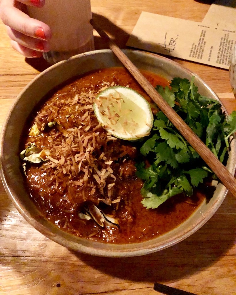 Our hearty main – definitely one to share – was the Khao-soi noodle laksa, oyster mushrooms (£16). Combining the Malaysian Laksa with the Chinese-influenced Thai Khao Soi Noodles, at it’s core this bowl is a red curry soup. Not much beats a laksa. With plenty of coconut cream and spices, the rich, curried broth melts in the mouth, noodles soaking it all in and each layer of flavour revealing itself stage by stage. That’s no surprise: the dish is itself is a product of 3 / 4 cultures. Originally from Hunan in Northern China and travelling down to Chiang Mai in Northern Thailand, Thai cooks created it here to cater for Yunnan based Chinese tourists and their taste for noodle soups. Like any laksa, this bowl is also about the garnishes – here, deep fried noodles, fermented mustard greens, plenty or coriander, cucumber ribbons and lime, the textures of each bringing the bowl to life.