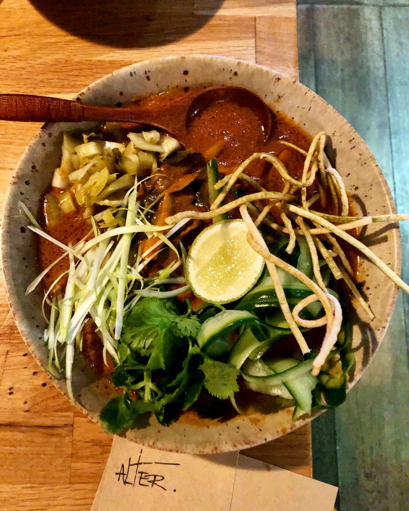 Most importantly, though, they know good food. At the front of Alter’s kitchen is Andy Hogben, an ex-actor who became a chef for restaurants including Dabbous, Andrew Wong, Som Saa and Kym’s. See a very enlightening interview with him, here. With an all-vegan menu, Andy created Alter in 2018 to challenge misconceptions around vegan food through a series of pop-ups and supper clubs, drawing inspiration from street-food cultures around the world.