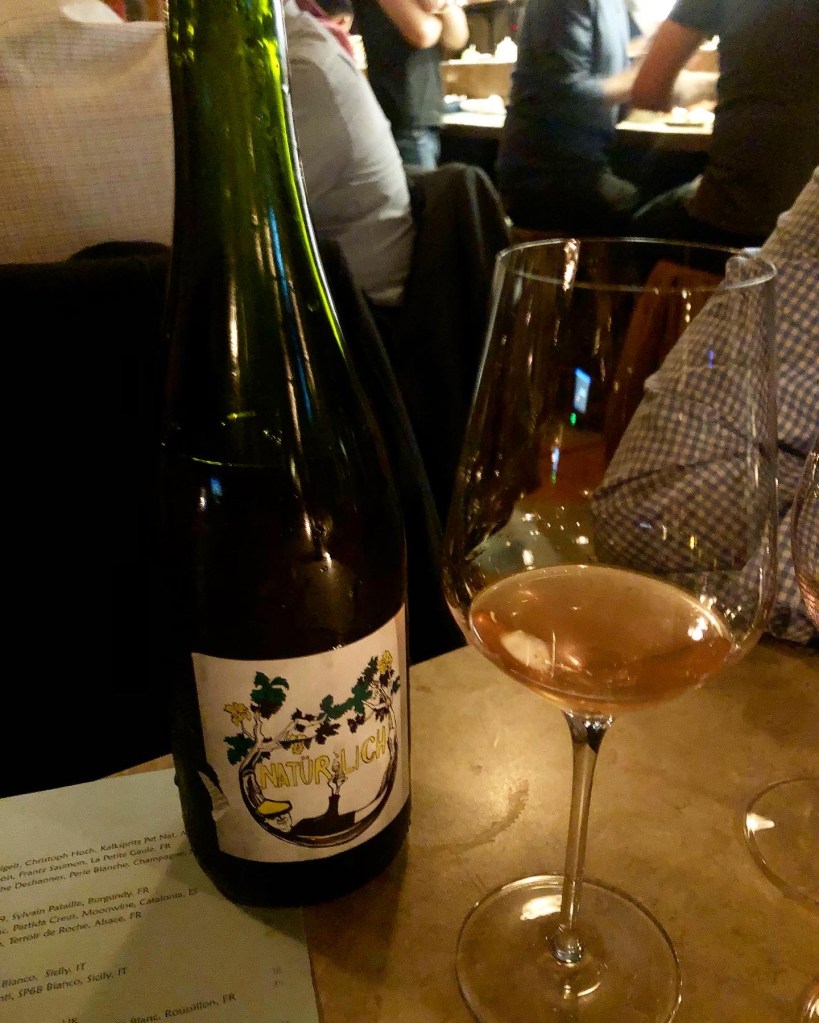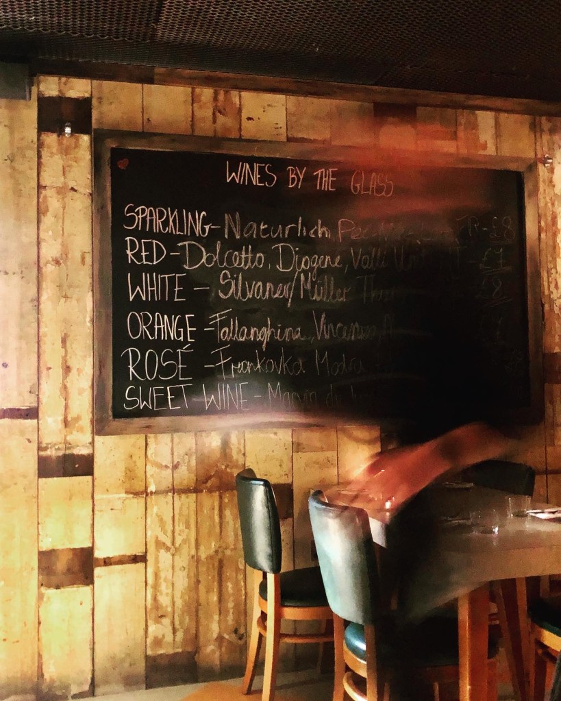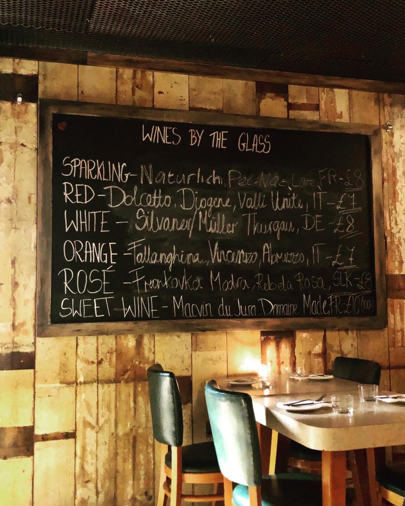 As you head down into this subterranean venue, the first thing you’ll see is their impressive bottle shop, with the walls stacked with bottles all from low intervention, natural, small-growers – including one of my favourites, Tillingham (East Sussex). The selection of wines is is enormours: in fact, they claim to have “the largest selection of bubbly in the city”.