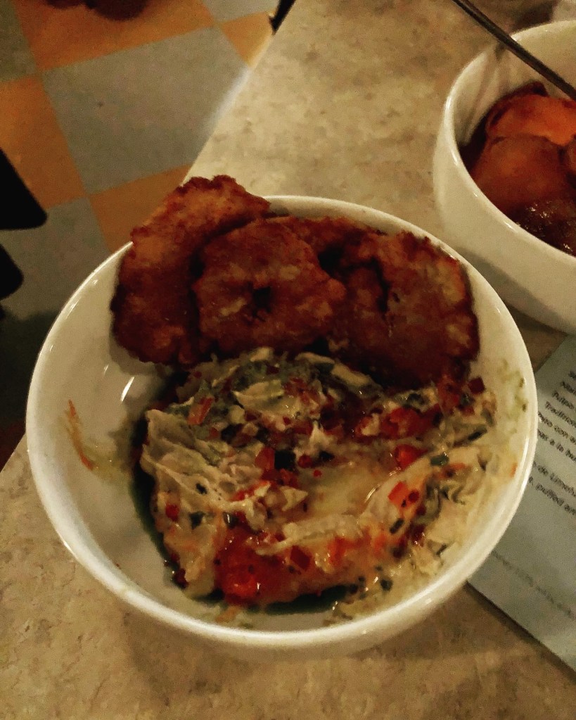 Foodwise, to start, we shared the Lima bean hummus & fried plantain tostones (£6). Traditionally conceived of as part of a Levantine mezze, this was my first taste of a South American take on one of my favourite dips and was a total eye-opener. Creamy, herby, with various salsas running through – a herby green one and a (chilli red?) one – this was worthy of eating by the spoon. Though the plantain chips were a perfect accompaniment – wonderfully crisp on the outside yet with a tender interior, bringing together this Peruvian take on hummus.