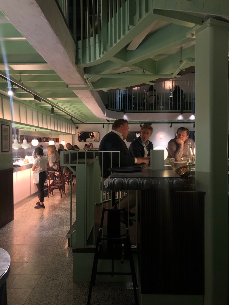 The space in the Bloomberg Arcade is a large one to fill but outfitted in Lina décor and hues, it’s undeniably beautiful. Spanning two floors, the spot centres around the large, circular chrome bar, whose bottle display gracefully hugs the curve of the staircase behind, all the way up to the overlooking mezzanine. True to their brand, the space is adorned with their signature mid-century pale pistachio green banquettes, green and white stripes, Italian style marble tables, distressed mirrors and gleaming silver fittings, all shone through low-slung opaline pendant lighting.