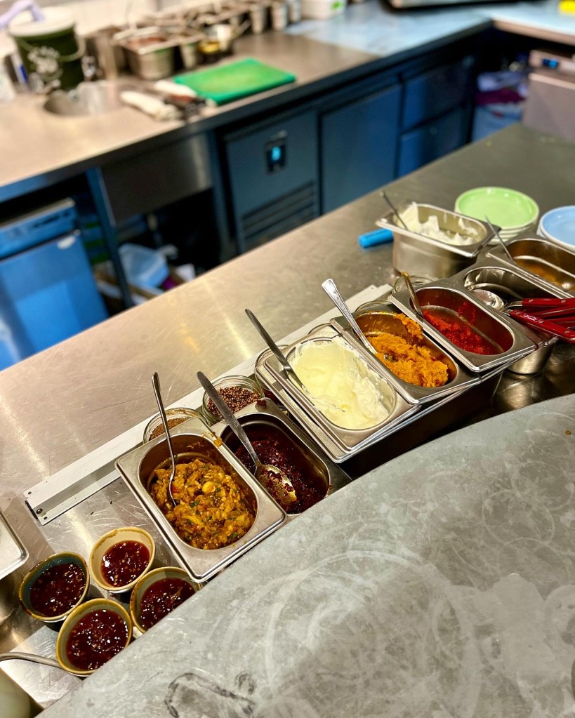 Notwithstanding it’s small encasing – or perhaps thanks to it – the atmosphere is warm (and became very warm temperature-wise on this July heatwave evening) and intimate, the space buzzing with eager diners hungry for some mezze action. For summer months, two tables are available outside. My companion and I were lucky enough to nab probably the two best seats in the house: facing the kitchen at the back, these are known as the “chef’s table” (notwithstanding the stool-seating). You inevitably (and happily) end up engaging in conversation with the chefs, who are of course the best at sharing their menu tips. More generally, the welcoming staff were not only attentive and efficient, but genuinely enthusiastic and knowledgeable, always happy to explain an ingredient and make well-judged recommendations.