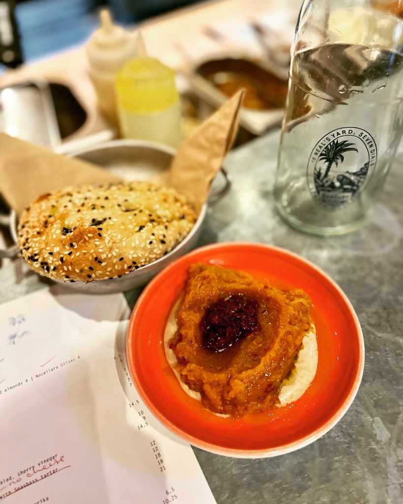 This evening, bread-wise my companion and I went for the Afghan khobz (£4.50). A pillowy soft sesame-encrusted round dough, warmed in the oven, its chewy texture makes it an ideal scooping mechanism. And since no bread is complete without a dip, we went for the Tahini dip (£7), given a fiery lick thanks to a topping of harissa and chilli.