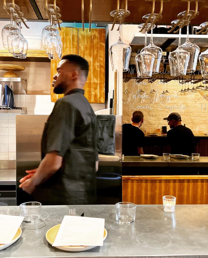 Much like its siblings, The Barbary Next Door it’s a tiny little haunt, seating 10. Actually, The Barbary Next Door is probably the sleekest of them all – this is a next door kind’a place after all. With seating perched around the zinc bar / kitchen, which snakes around to hug the exposed-brick blushed pink wall behind in a utilitarian-chic counter set-up, it’s a small but masterfully designed space. The big mirror opposite the counter gives the illusion of a bigger space; wine bottles and glasses hang from the ceiling; the lighting is soft – all making for a very convivial vibe. For such a small sliver of a restaurant, the space is utilised in a very smart way.