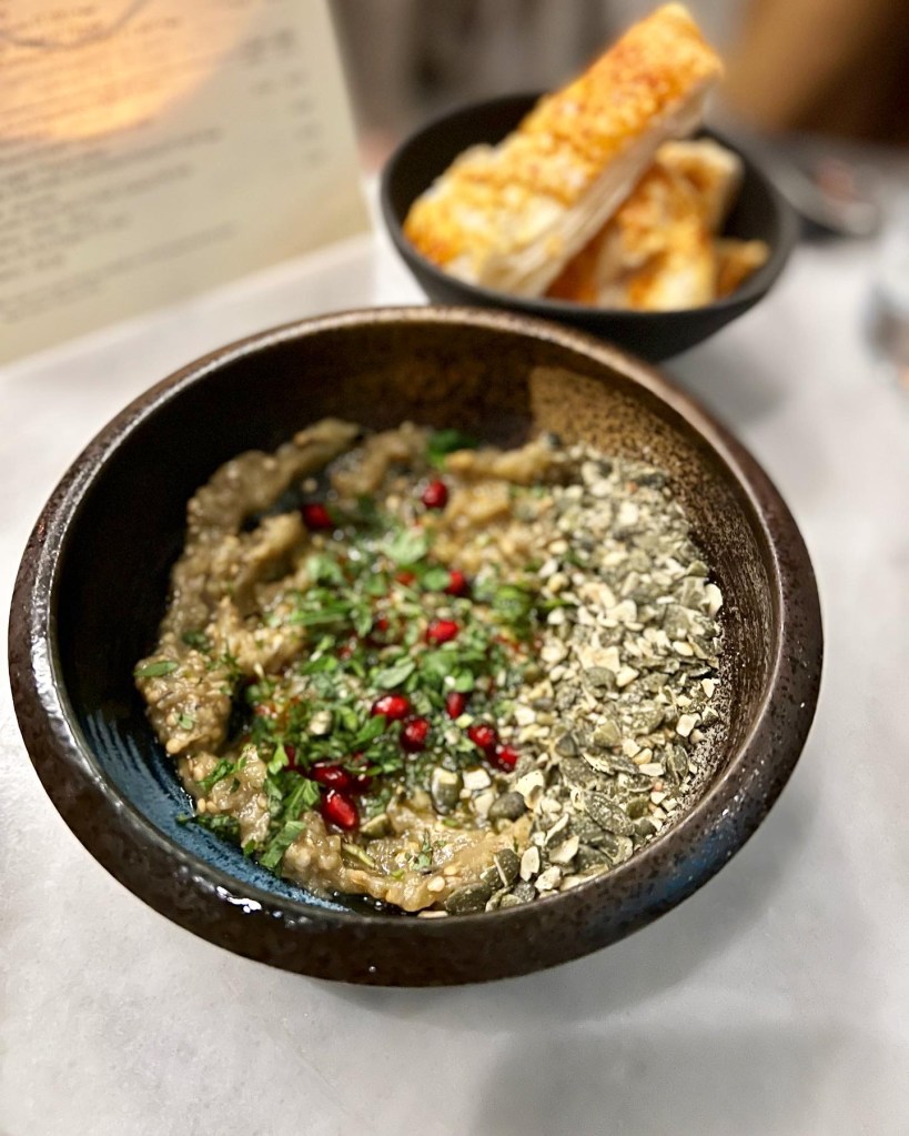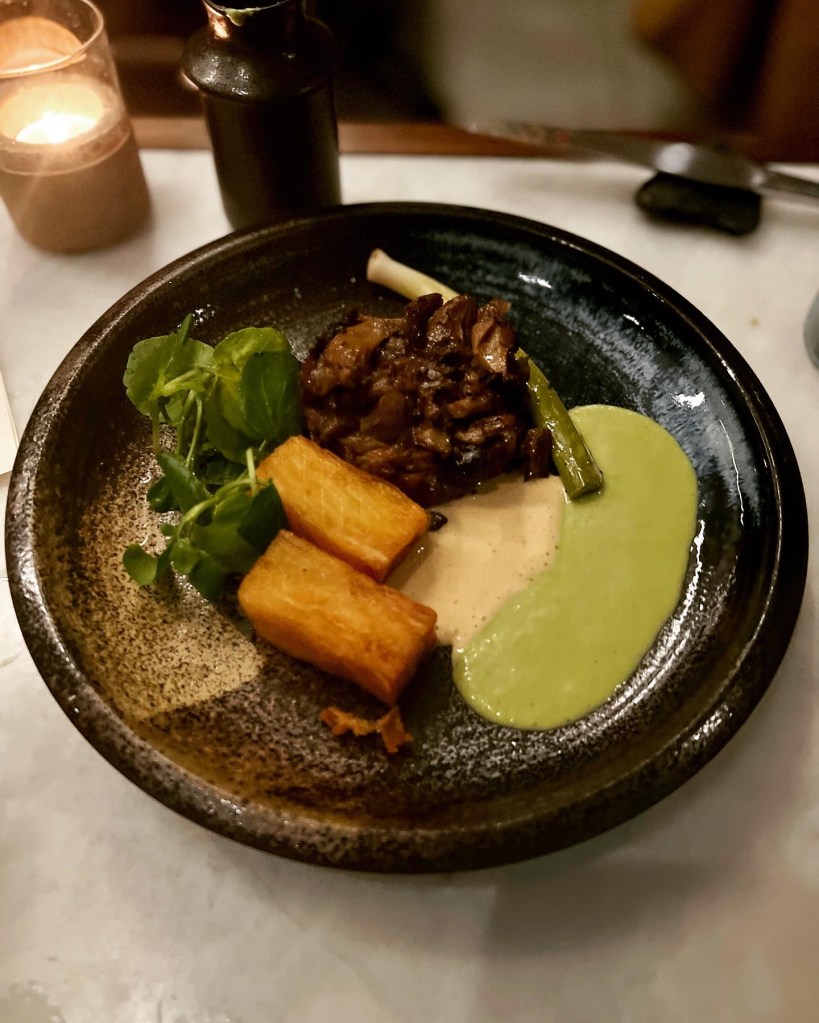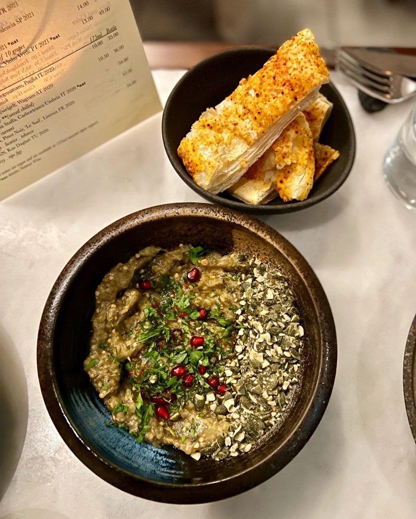 A tasting discovery menu is on offer for £39. However, as we were keen to try the wider spread of dishes on offer a la carte – the choice of which is colourful, fresh and uncompromised by cuisines – we went for that. To Snack, we went for Aubergine with pickled chillies, puff pastry and tahini (£5). The aubergine was warm yet incredibly smokey, smooth and moreish. In deconstructed fashion, the pastry is served separately for scooping up this babaghanoush-like dip. Sadly, though, it lacked that satisfying crisp you expect from pastry. In mezze style, the aubergine could also probably have been creamier.