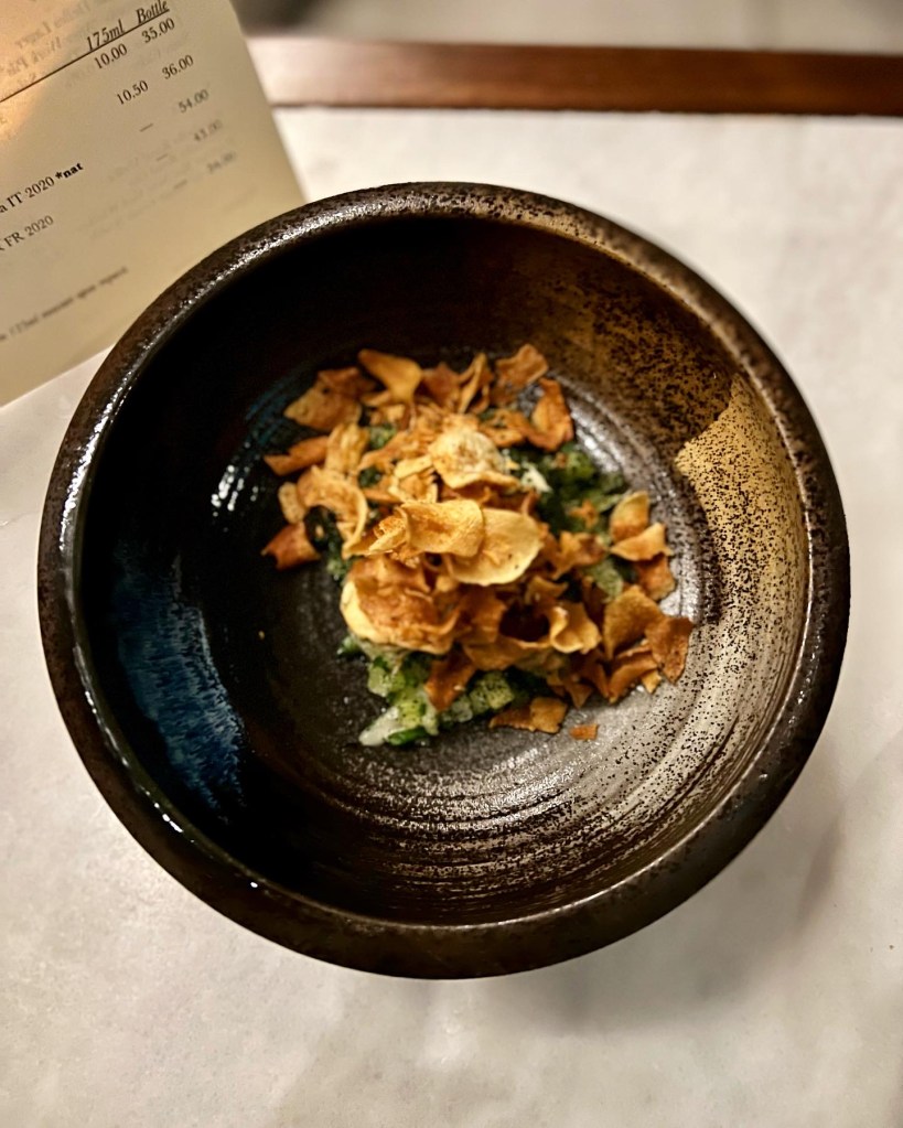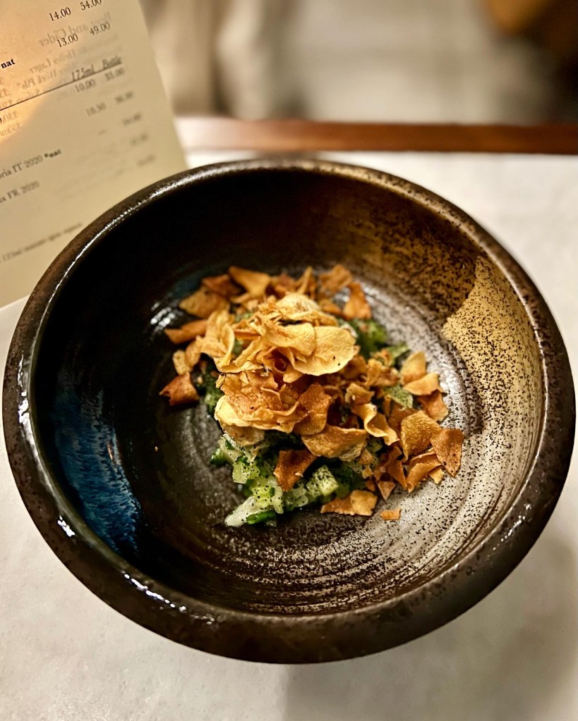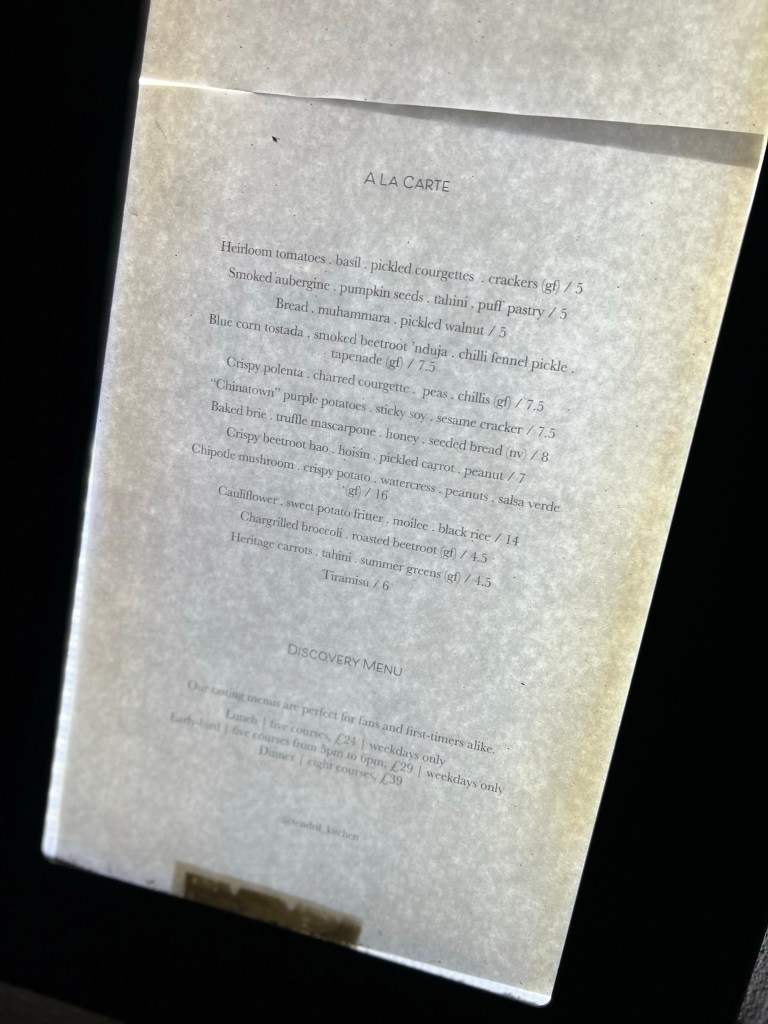 Though I’m not usually one to choose a vegan restaurant, Tendrill doesn’t qualify as that exactly – it self-describes as a “(mostly) vegan kitchen”. I’m also not one to choose a restaurant that charges £80 for an cancelled reservation. But the only compensation offered on my follow-up plea to founder and chef, Rishim Sachdeva, was a £40 credit note. So I reluctantly rebooked. Not exactly the best start to a dinner here, especially given an important factor of any restaurant is service and experience. Nevertheless, I write this review on a non-biased basis, untainted by the £40 charge levied on my Amex…