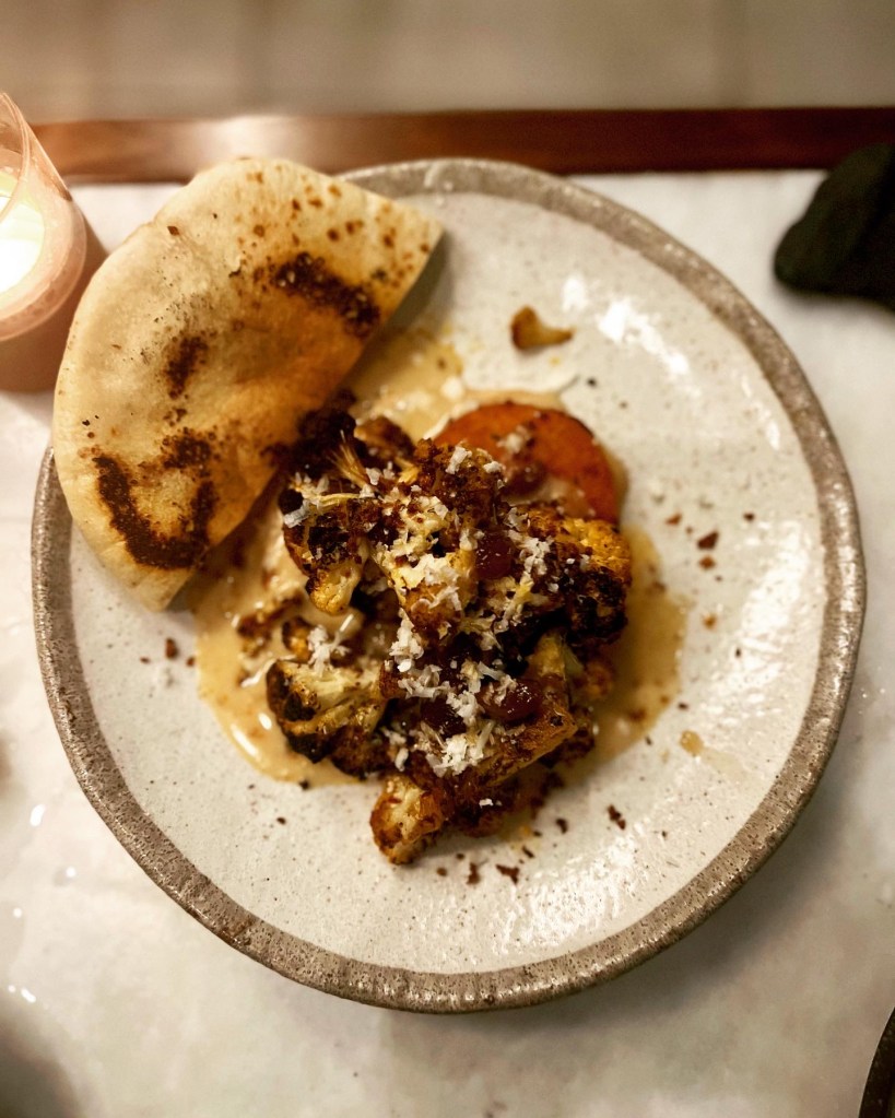 Our other Large Plate – Roasted Cauliflower with sweet potato fritter, moilee and pita bread (£16) – delivered on all fronts. Cauliflower and tahini is a fail safe combo and this take didn’t disappoint. Smokey, wonderfully charred and slathered in tahini, the vegetable was cooked to perfection. The accompanying fritter was deliciously sweet, though very small in portion.