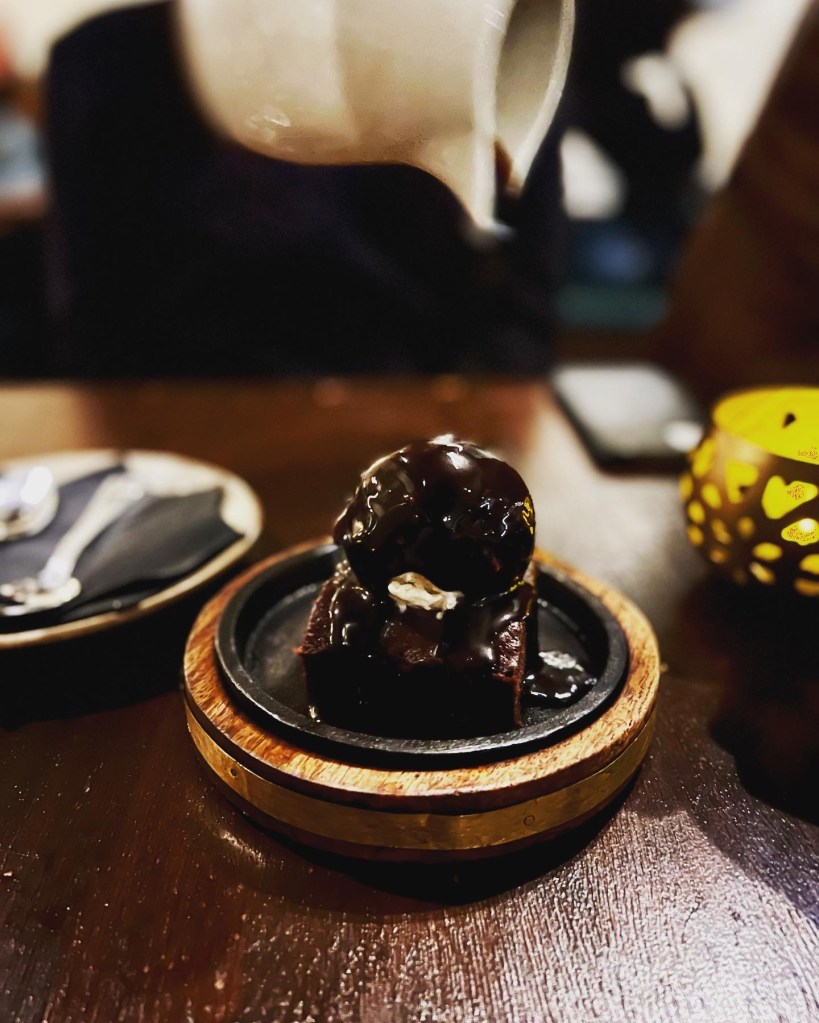 To finish, we tried the Sizzling Brownie with Madagascan vanilla ice cream (£9.50). The dish was very reminiscent of a similar but warmer sizzling brownie served in a seaside Mumbai café. Served on a heat-resistant plate, the brownie is topped with a generous scoop of vanilla ice cream but the icing on the cake (or the brownie…) is the hot chocolate sauce poured over when served. Given this was the vegan take, the chocolate was dark, taking the desert to another level of richness. Probably a bit too chocolately for me, it’s nice to see the restaurant recreating so many of these authentic Mumbai treats.
