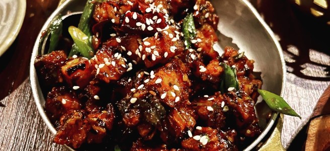 Onto food, the menu is split into vegetarian, seafood, and meat dishes and packed with unusual-sounding dishes that live up to their descriptors. Think punchy flavours and bold dishes. We started with Vegetable Momos (£5.50), probably the weakest dish of the evening. Pillowing steamed dumplings common across South Asia, these ones are filled with tofu, mushrooms, spinach and courgette. Influenced by Bhutan, Nepal, Tibet and other parts of the Indian subcontinent – these Indo-Chinese dumplings are served with spicy sesame and red pepper chutneys. It’s definitely worth not skipping on the chutneys – the interior was a little bland and the filling fairly light. The accompanying sauces are needed for necessary flavour and heat.