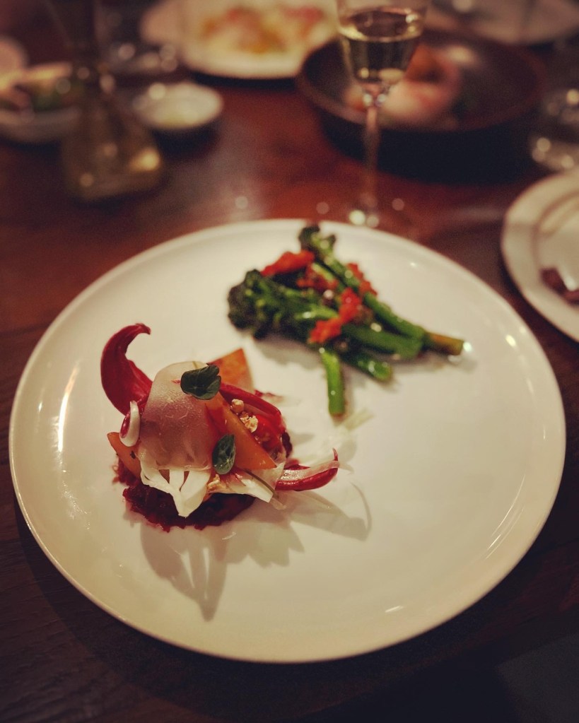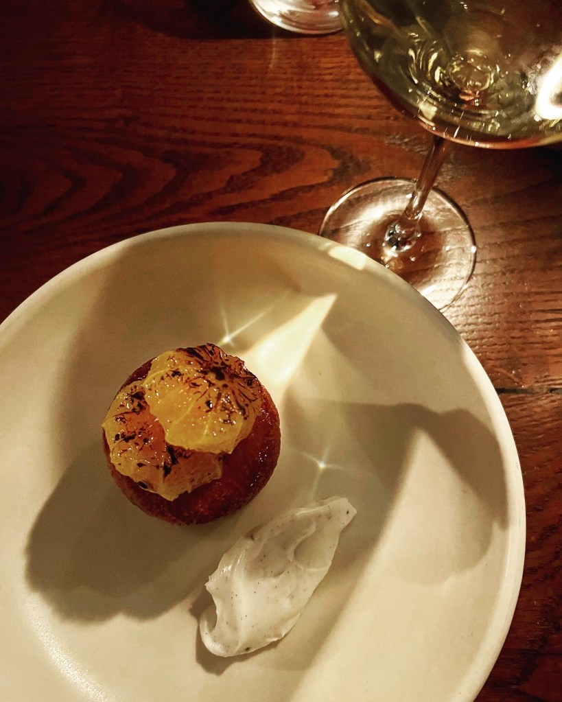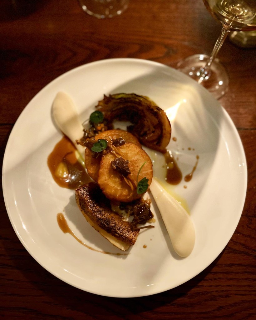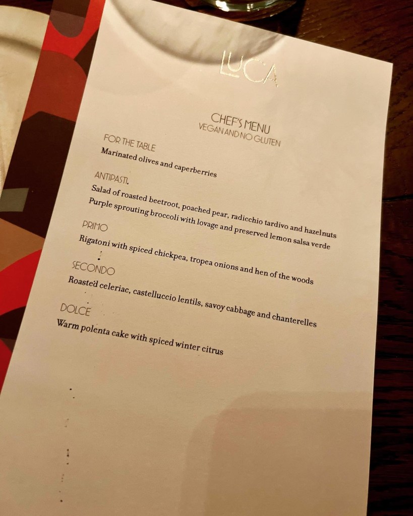 Next up, was the pasta, what Luca is known for. The chefs make the pasta daily in-house and the vegan offering today was Rigatoni with spiced chickpea, tropea onions and hen of the woods. The aesthetics and very al dente texture were wonderful. A gleaming bowl of Autumnal pasta tubes that melt in the mouth, this felt like upscale country comfort food – a blend of trad-rustic and fancy. The chickpeas were out of site so I assume they’d been blended to form the creamy beige sauce that seemed to envelop each pasta piece – though a touch more sauce would’ve been welcome. The seasonal mushrooms lent a woody note – though more tart onions and mushrooms would have been welcome too.