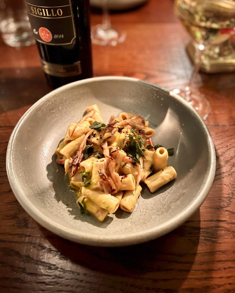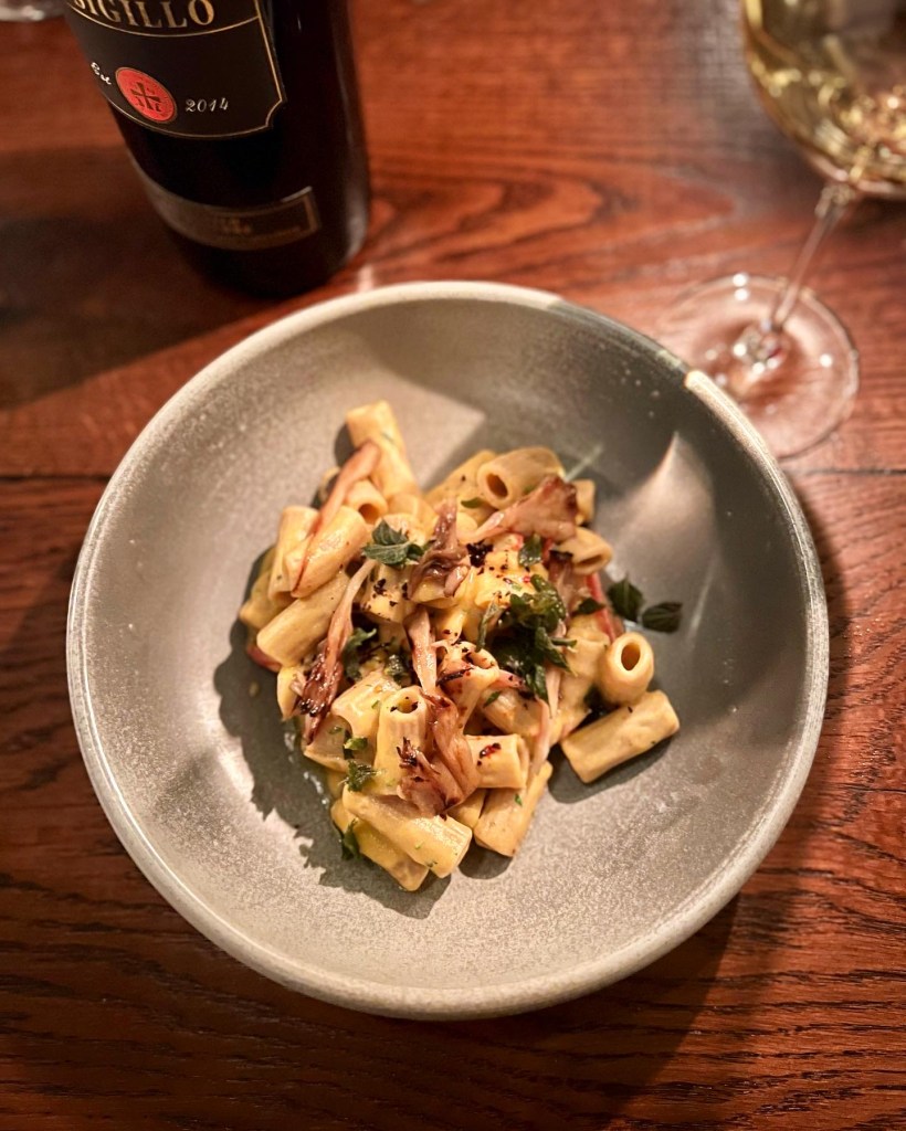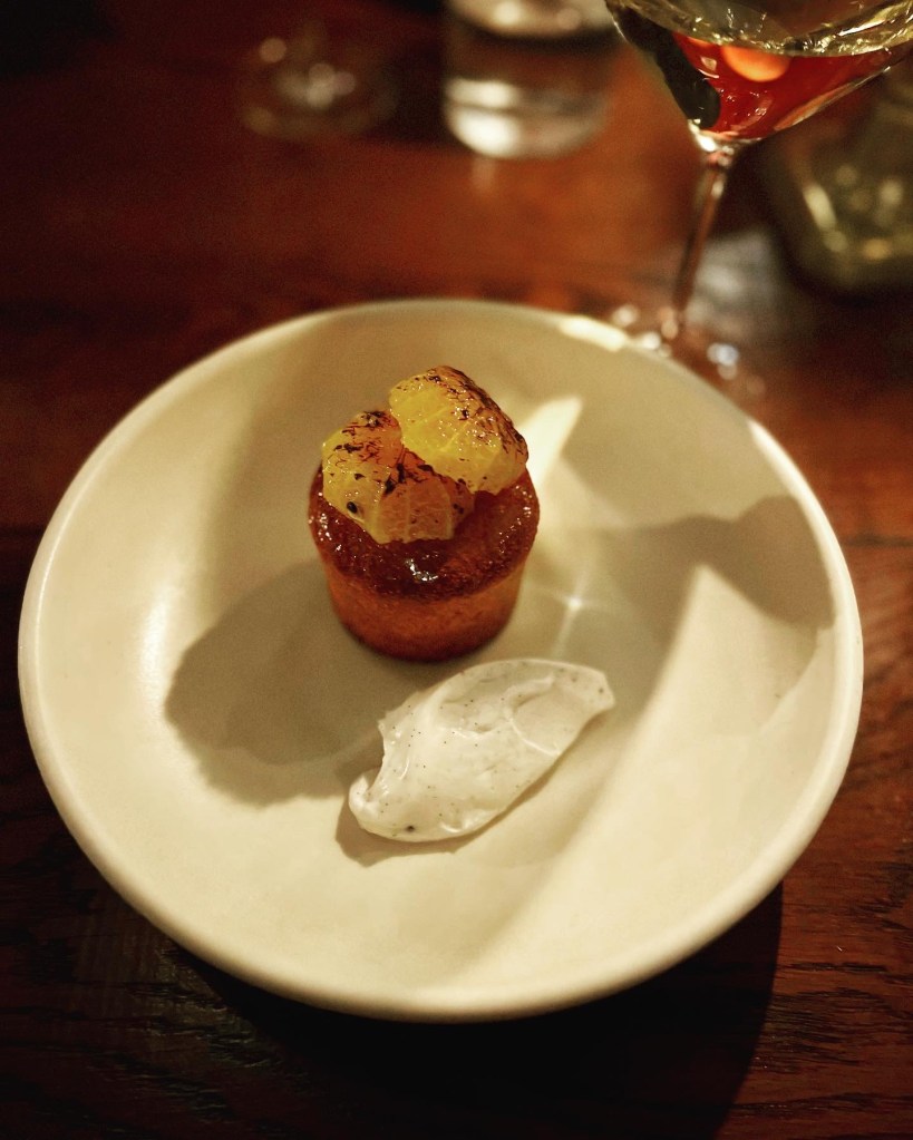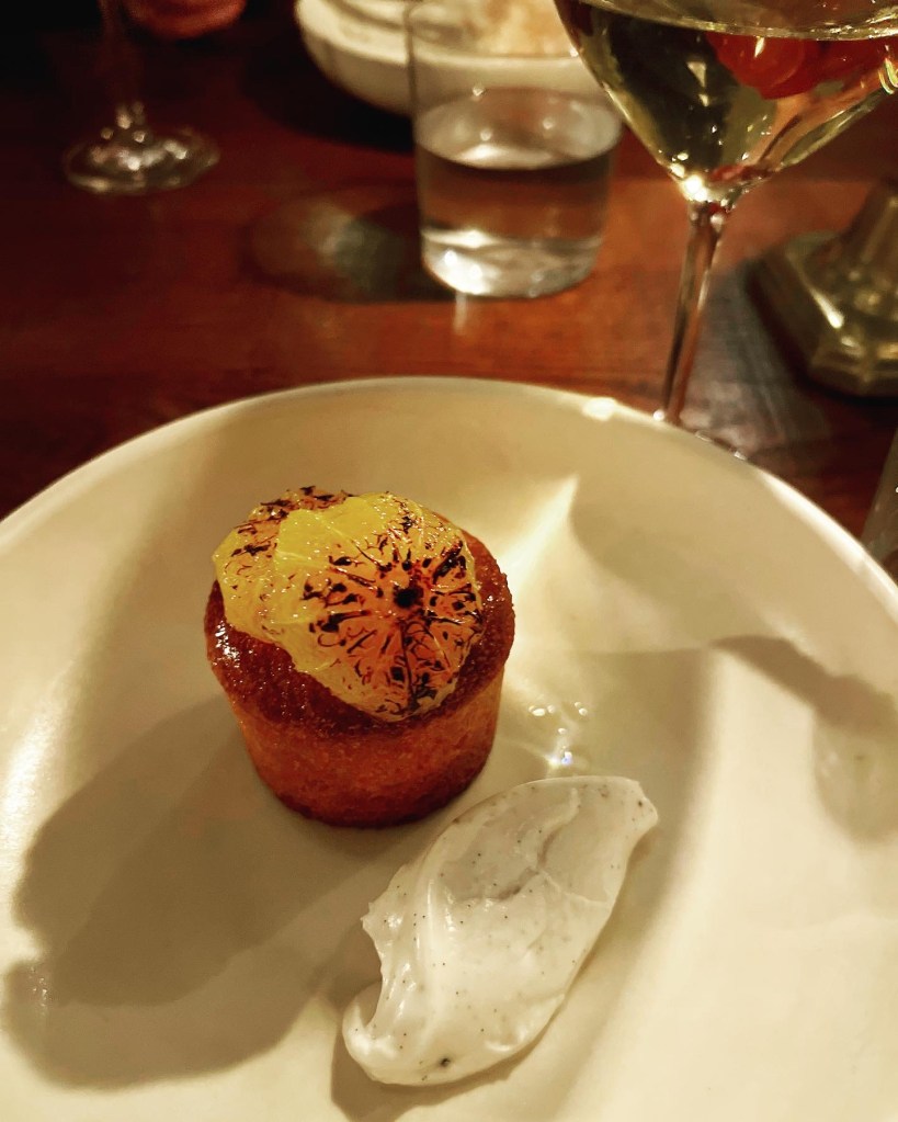 Next up, was the pasta, what Luca is known for. The chefs make the pasta daily in-house and the vegan offering today was Rigatoni with spiced chickpea, tropea onions and hen of the woods. The aesthetics and very al dente texture were wonderful. A gleaming bowl of Autumnal pasta tubes that melt in the mouth, this felt like upscale country comfort food – a blend of trad-rustic and fancy. The chickpeas were out of site so I assume they’d been blended to form the creamy beige sauce that seemed to envelop each pasta piece – though a touch more sauce would’ve been welcome. The seasonal mushrooms lent a woody note – though more tart onions and mushrooms would have been welcome too.