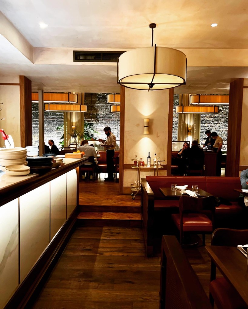 A twist on the traditional trattoria and not a fine dining restaurant, Luca sits somewhere in-between, serving refined Italian cuisine in a casual but gorgeous setting. That sense of age, mixed with modern design, plays through in Luca’s interior. Considered to be one of the most beautiful restaurants in London, its unassuming very green exterior – featuring exposed brickwork, natural plaster and warm oak – lend the restaurant a sense of antiquity. Step inside and make your way past the marble bar, and you reach a modern space with double-height ceilings and train-carriage style booths, filled with natural light and a cacophony of ambient chatter.