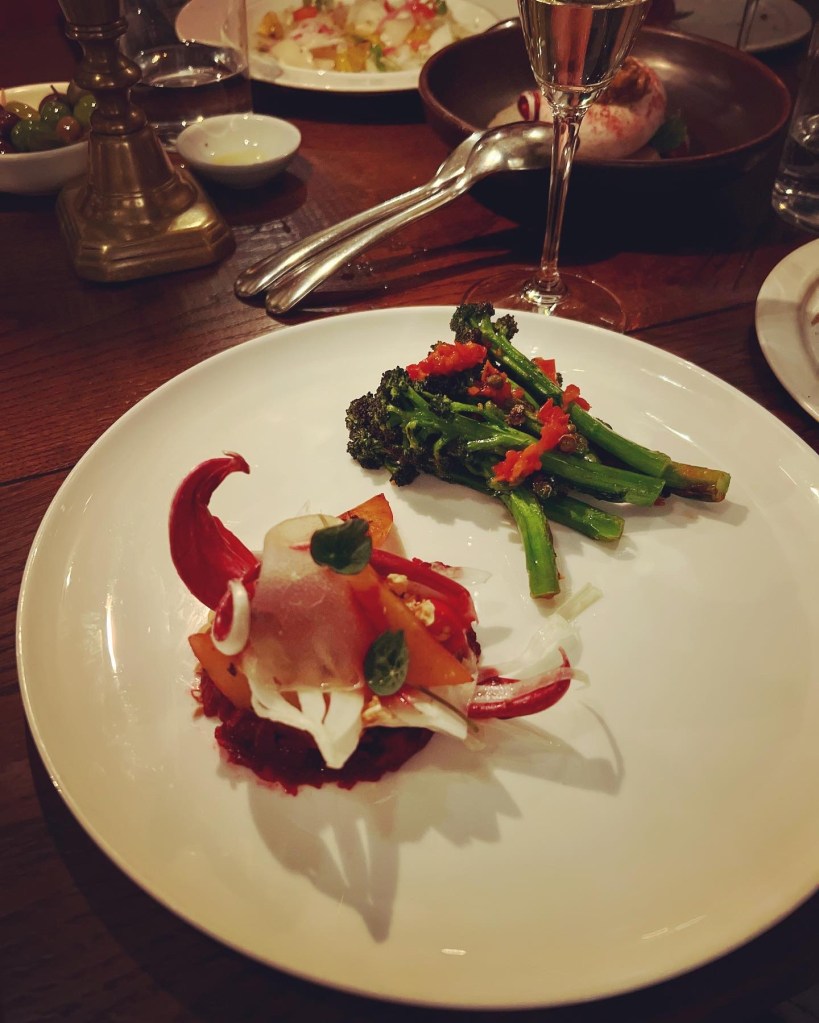 To open, we were served with some very juicy Marinated Olives and Antipasta: a Salad of roasted beetroot, poached pear, radicchio tardivo and hazelnuts, and another of Purple sprouting broccoli with lovage and preserved lemon salsa verde. The broccoli was full of flavour and panache, with the punchy salsa providing a kick of flavour and saltiness. The radicchio was a little to bitter for me and the pear not as ripe as I’d hope but the beetroot was seasonally sweet and a feast for the eyes.
