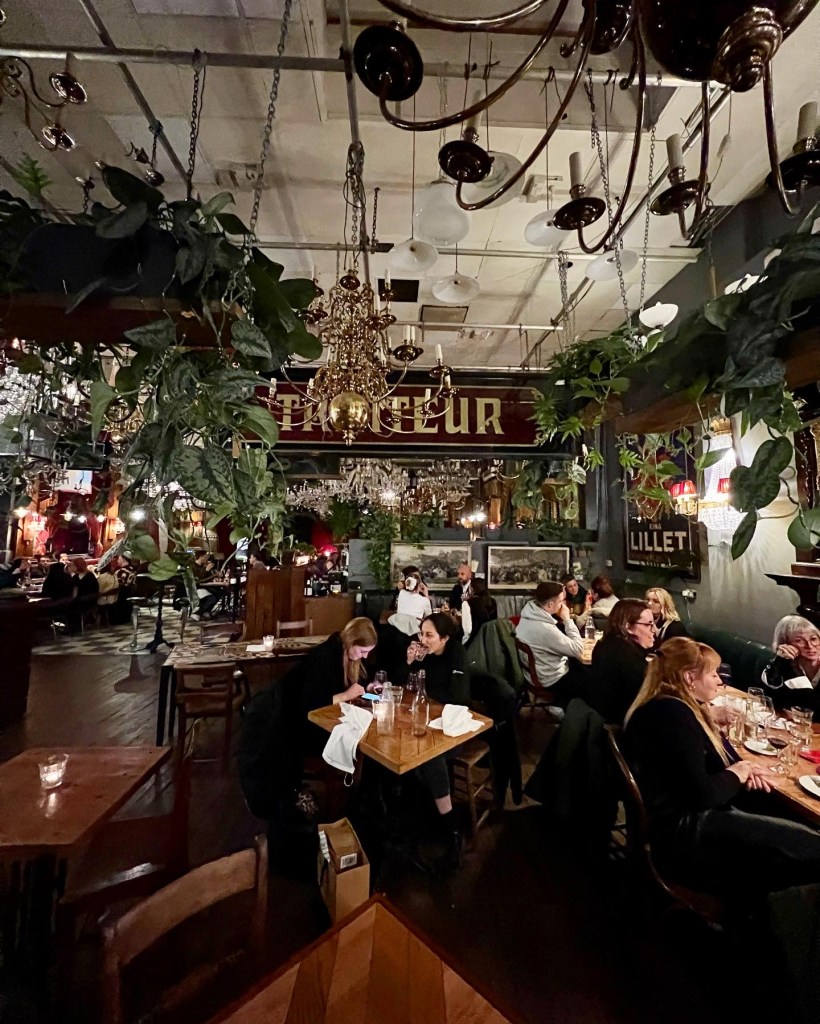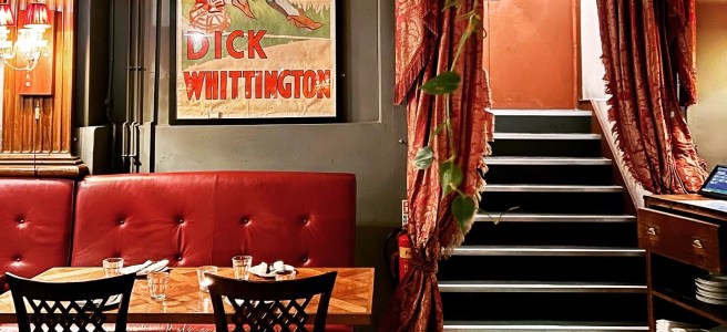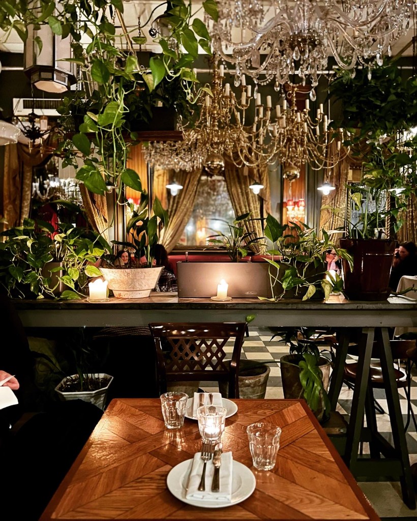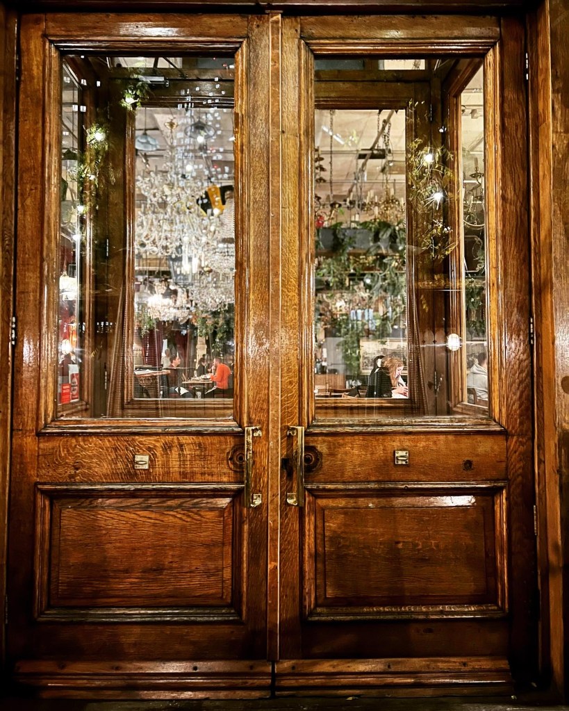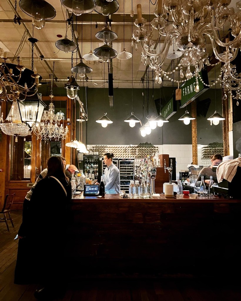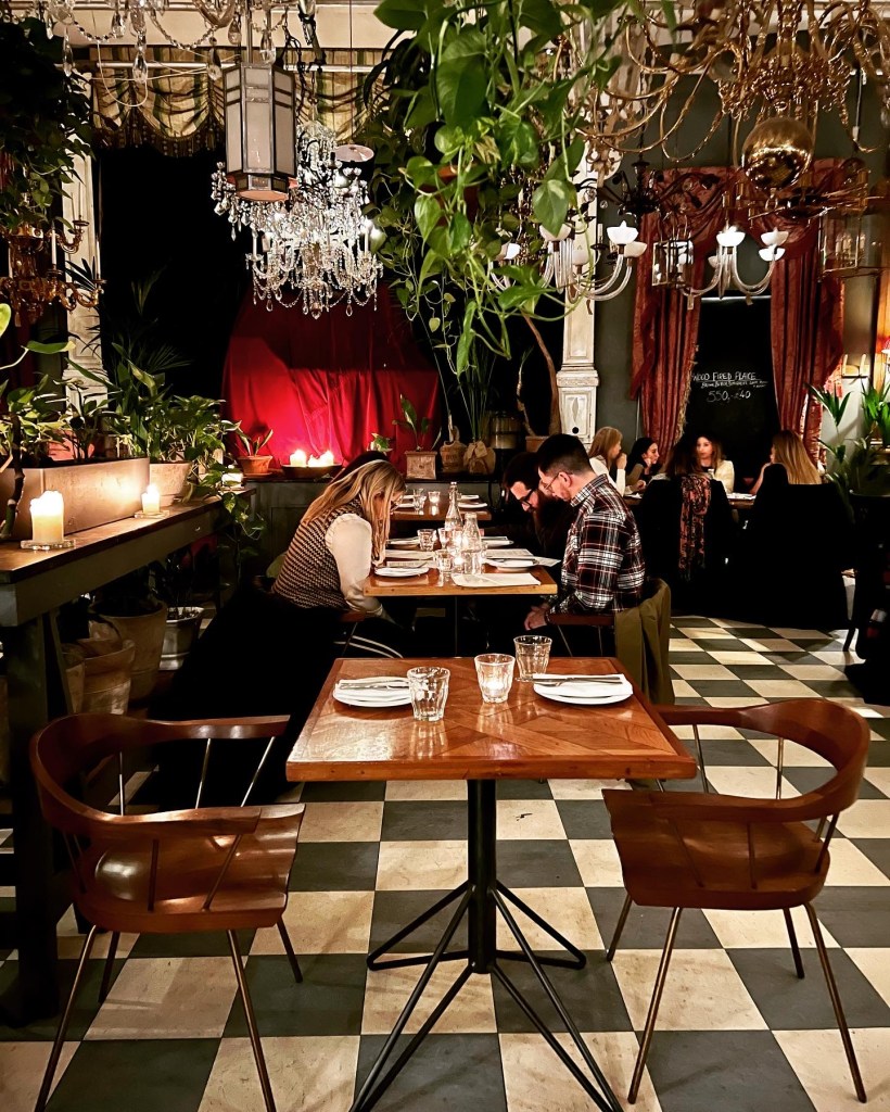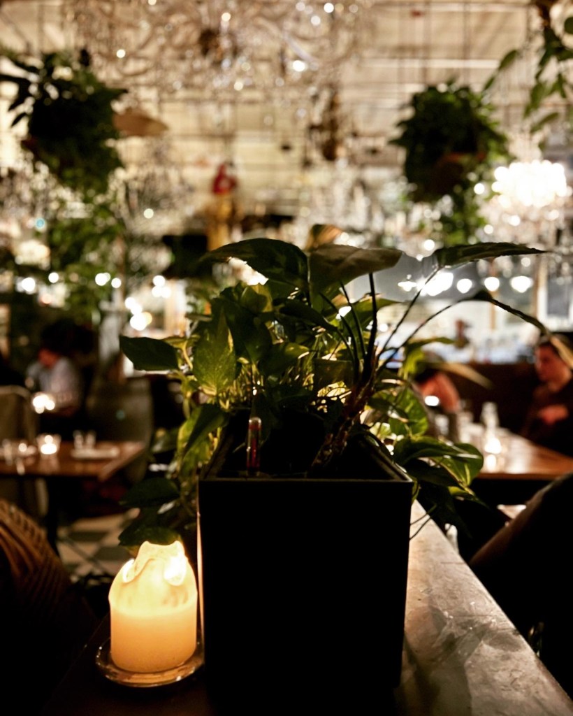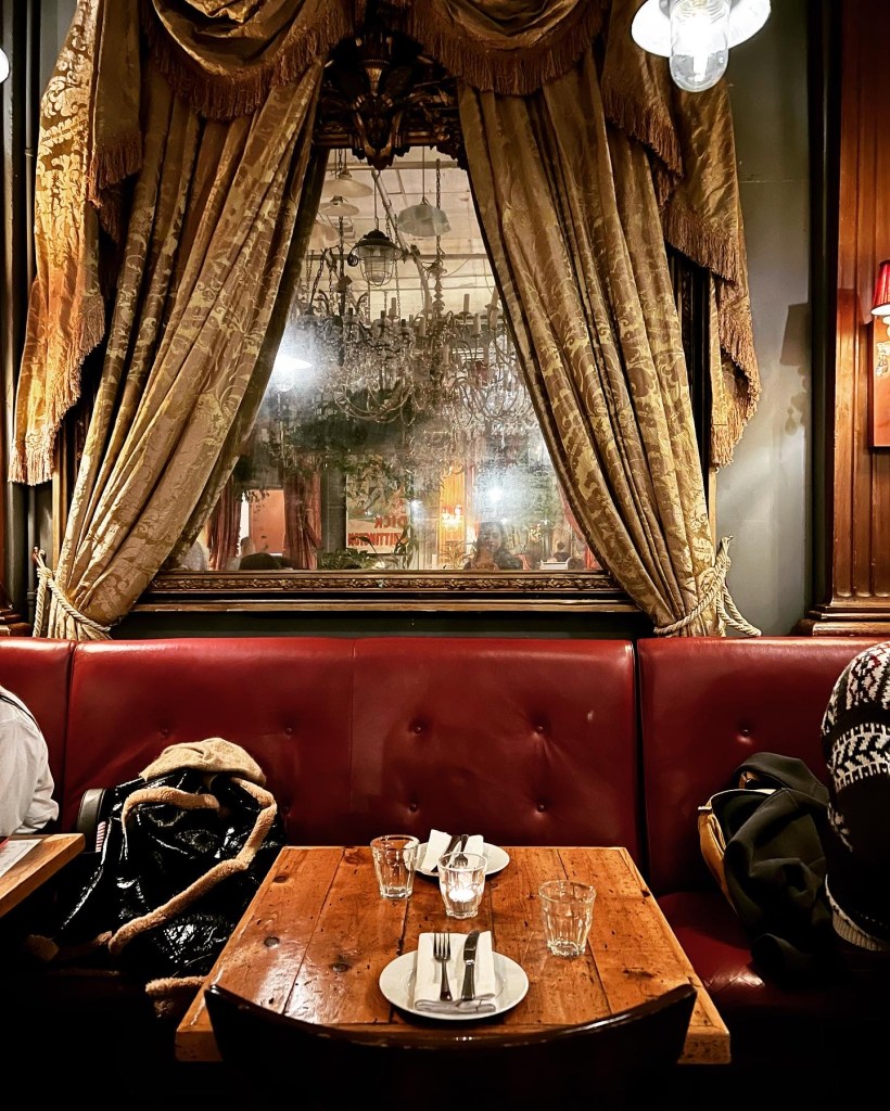 The building itself is worth a visit. Quirky and historic, it rests under the care of LASSCO, an architectural salvage company who rescue vintage furnishings, masonry and entire walls from historic buildings before they’re knocked down. This explains the eclectic decor of the ground-floor restaurant: an intensely romantic, high-ceilinged space lit by a suspended canopy of chandeliers, disco balls and the odd reclaimed lantern. An odd array of vintage tables and chairs are scattered throughout and everything – from the fireplace to the mirrors – is for sale. Picture old rugs, bare wooden tables, a few booths made from red-leather banquettes pushed into place and dangling from the ceiling, a myriad of old chandeliers. Much like the food, things appear thrown together randomly but make a lot of sense.