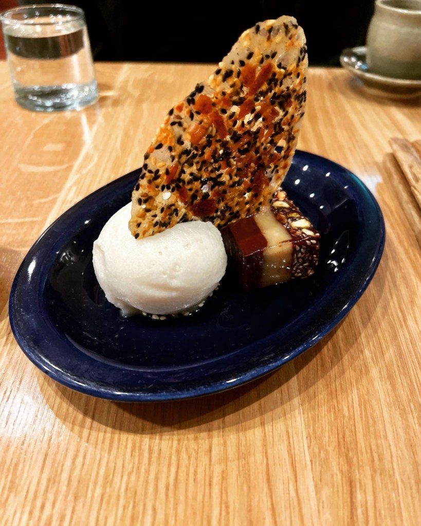 To finish, we shared the vegan Chocolate terrazzo cake (£9.50), a three-layered affair featuring a dark chocolate mousse base, a sesame interior and a nutty almond and pistachio crunchy topping. Served with a sesame tuile and a refreshingly light marzipan sorbet, the plate offers everything you want from a desert: chocolate, nuts and freshness. Unbeatable.