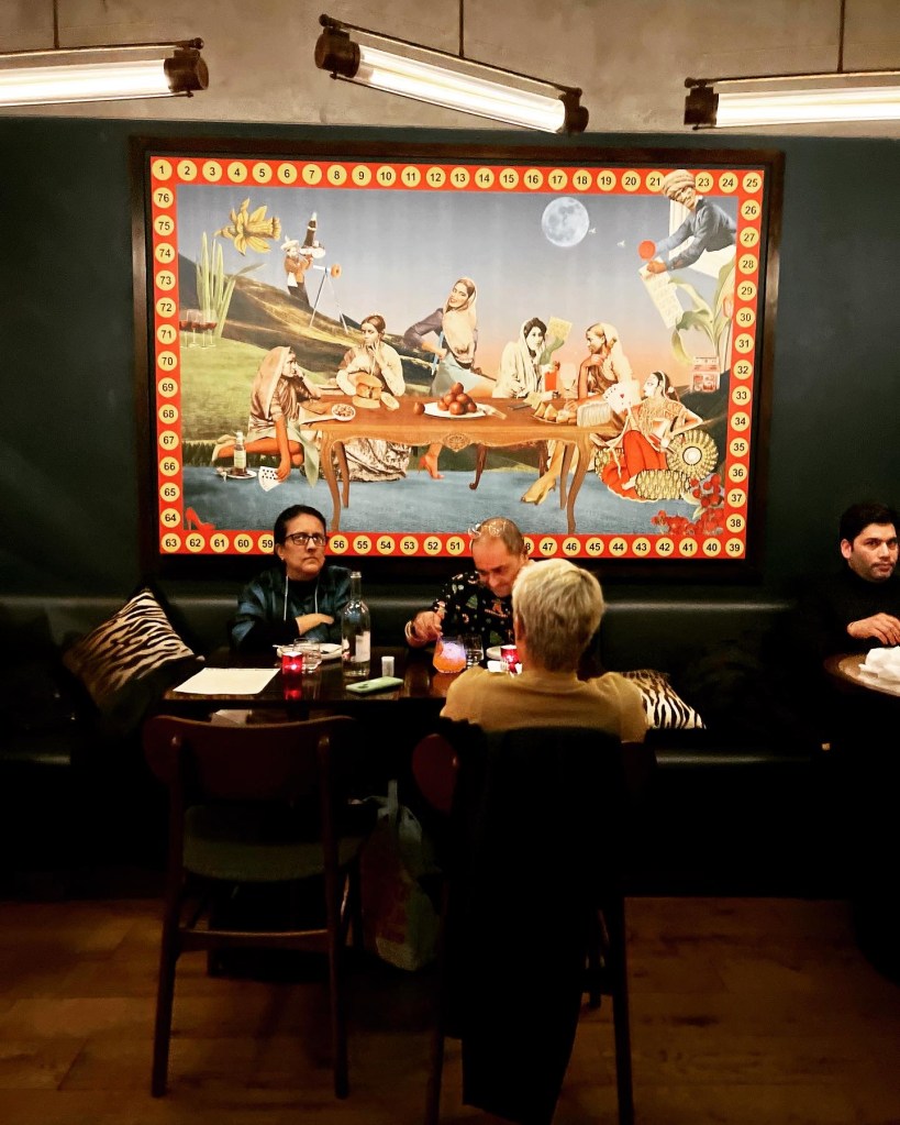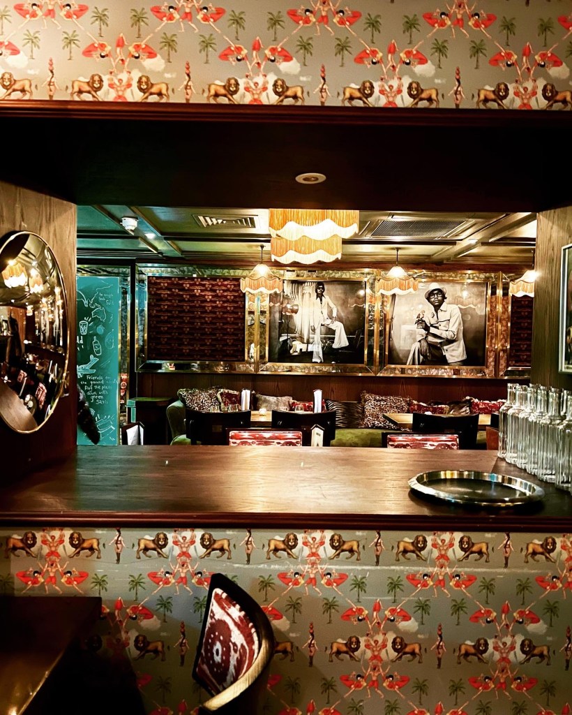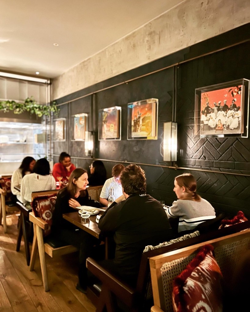 On the ground floor, the vibe feels exotic and inviting thanks to dimmed lighting illuminated by bright Indian paintings and posters. Whether you’re cosying up among colourful cushions in the art deco-inspired interior or sitting at the kitchen counter, the ambience is intimate.