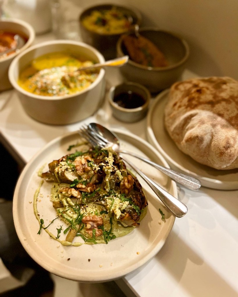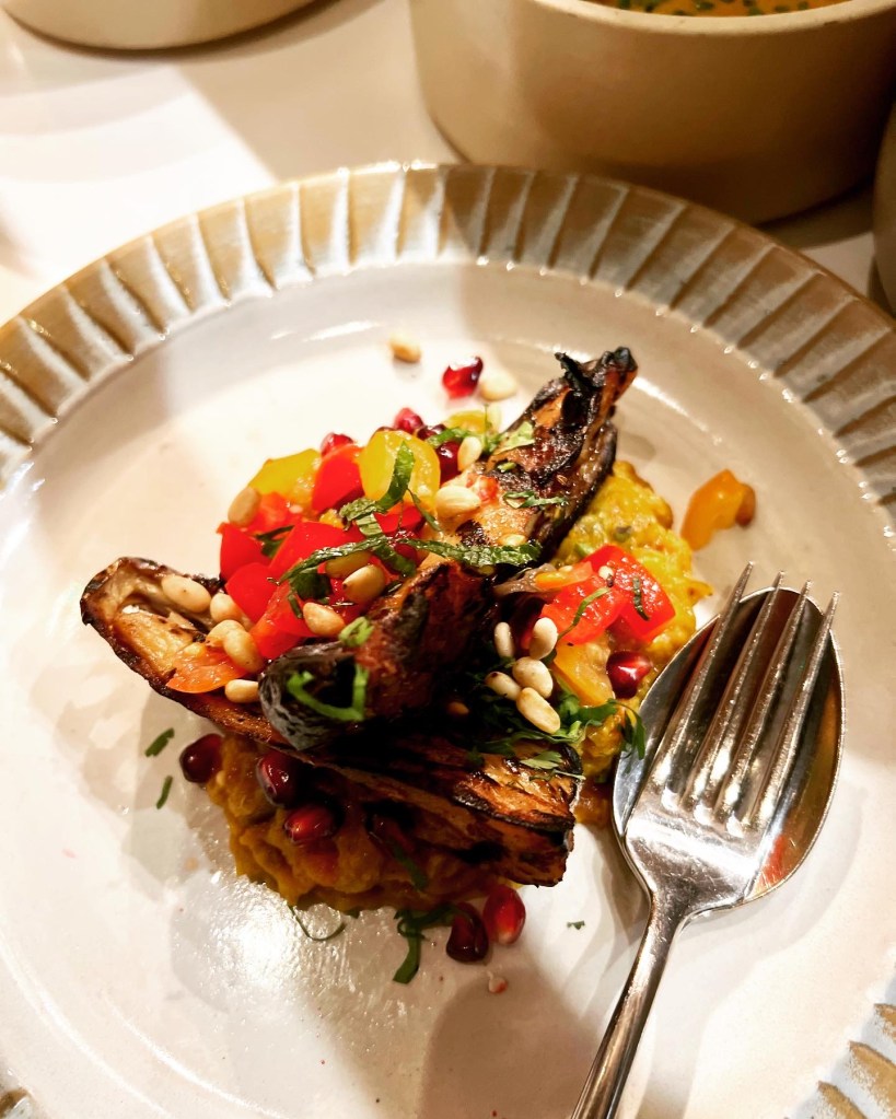 Keen to ensure I did not leave hungry, the attentive chef kindly sent another (vegan) Tandoori dish: the Pale Aubergine Bharta (£14). Cooked on the open fire and spiced with cumin, the smokey flavour of the aubergine sung through and complemented the slow-cooked daal upon which it was resting ideally. To provide some freshness, tomatoes and pomegranates were scattered above, elevating the dish in Christmas spirit. Another incredibly vibrant dish.