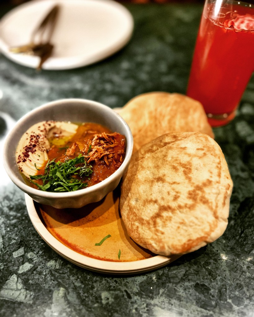 The drinks menu extends from contemporary twists on old Israeli favourites to fermented fruit and herbs combined with vodka and arak. I went for The Glory Mole (£15). A mix of tequila, hibiscus, cardamom, ginger, lime and soda, this tasted like a herby meets fruity (and boozy) taste of old Tel Aviv. Very fresh and light.