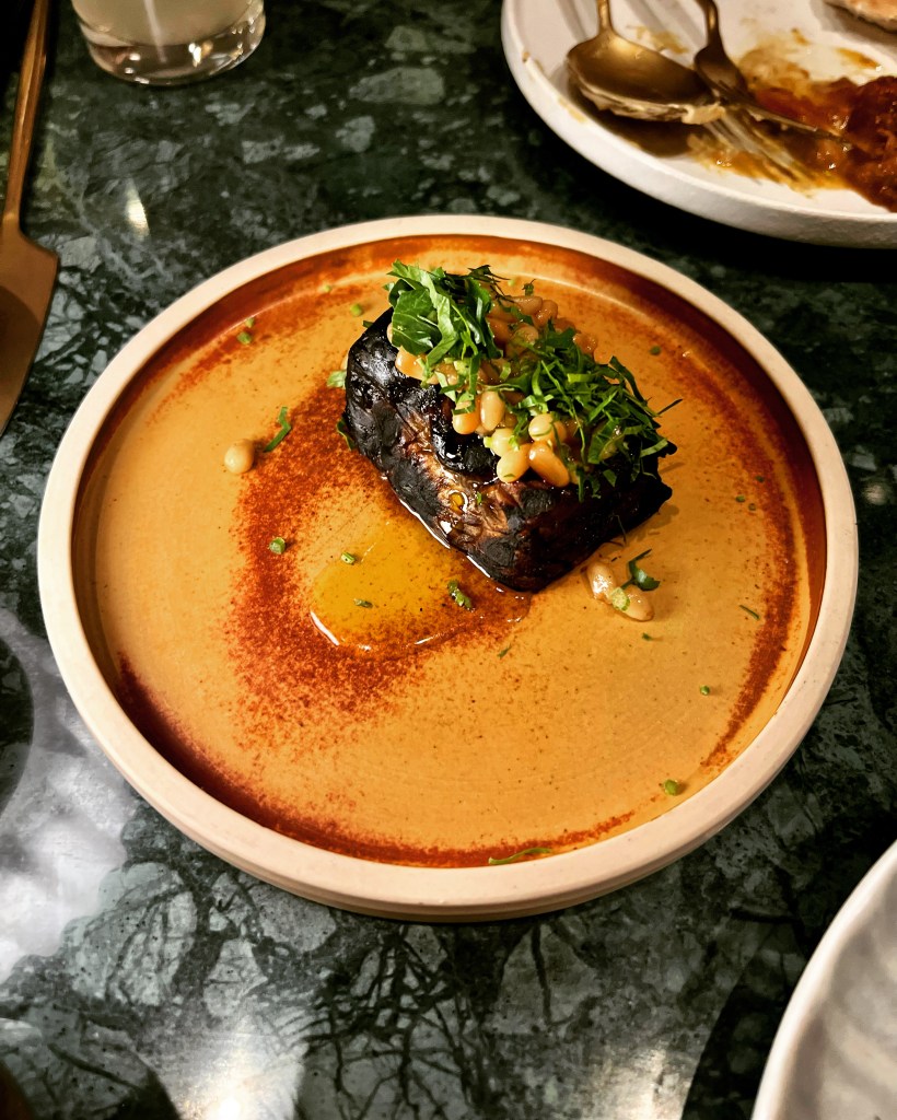 Onto Plates proper, the (competing) star of the evening was the Aubergine Heart (£12) seasoned with pinenut jam, tahini and clementine marmalade. Tender soft and full of flavour – simultaneously smokey burnt yet envelopingly sweet thanks to the caramelised pine nuts and runny tahini – each bite was melt-in-the-mouth and totally deserving of the dish’s descriptor as a heart. My only complaint was that the aubergine isn’t cut big enough – especially for sharing plates. A tease made all the more heart-breaking this close to Valentine’s.