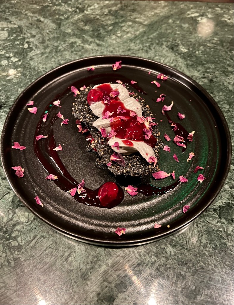 For a Sweet Ending, my companion relished the beautifully light and picture-perfect Open Sesame (£9). A mille-feuille made from black sesame tuilles, the layers were juxtaposed with black tahini yogurt and cherries. Having sampled the black sesame tuille, I can confirm this course represents the versatility of tahini, in both a (here) sweet and savoury context. A light desert that finishes off a meal here effortlessly well.