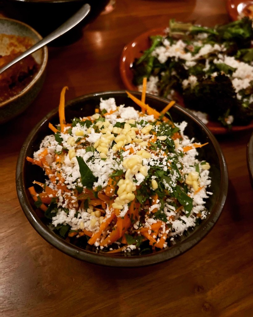 The Flourish Farm purple broccoli varia (£10.30) and Carrot, yellow lime & coconut sambol (£6.20) function more as side-show salads. The veggie of each dish is brightened and enriched by coconut and carefully tempered spices – mustard and cumin seeds. Though it’s great to see coconut sambal being showcased in this way, both dishes were on the dry side and would benefit from a creamy yogurt to go with.