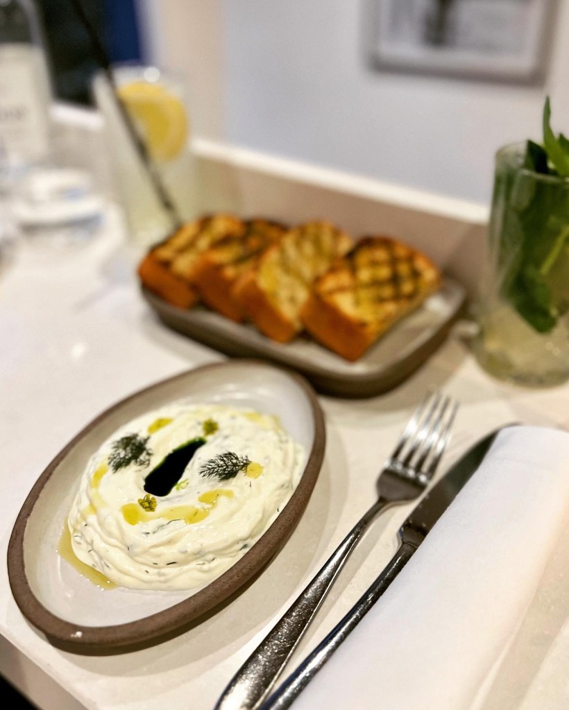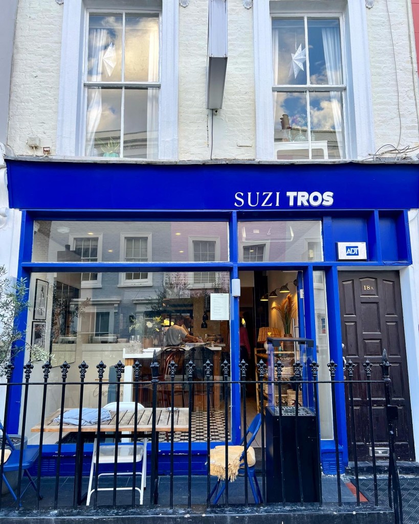 For me, Greek food screams Spring / Summer. So Notting Hill’s Suzi Tros – which conjures up all the vibes of the Mediterranean, visually and culinary – was a natural choice for small plates over Easter weekend’s very blue skies and the final arrival of Spring. For years, you could count the number of genuinely good Greek restaurants in London on one hand (on this, see my review of Opso here). In short succession though, two sizzlers rocked up. First came Notting Hill’s excellent Mazi, opened seven years ago by Christina Mouratoglou and her husband Adrien Carre. Christina is from Thessaloniki, claimed by some (probably people from Thessaloniki) to be Greece’s culinary capital. Just a few months later, a spin-off next door, Suzi Tros, opened. More widely, Notting Hill seems to have become a centreground for Greek food – Zephyr (sister to Pachamama and Chicama) is also on My List.