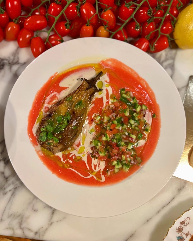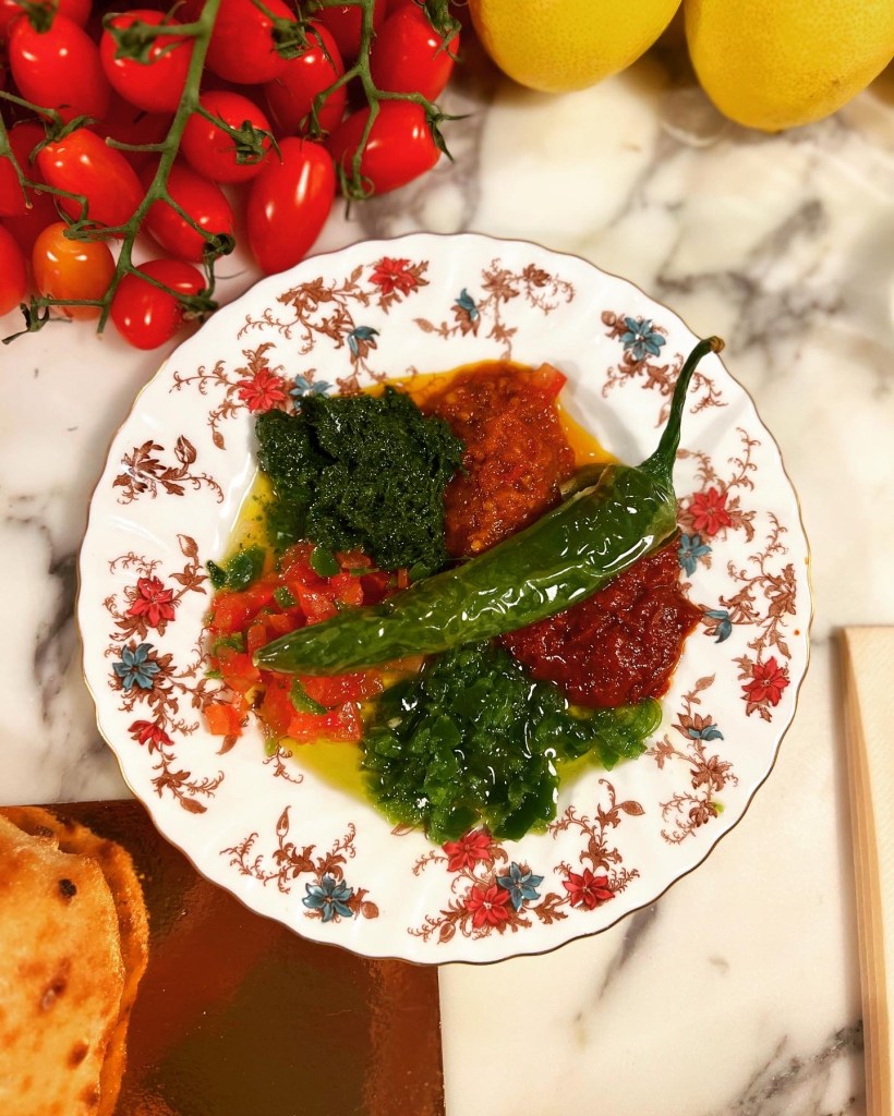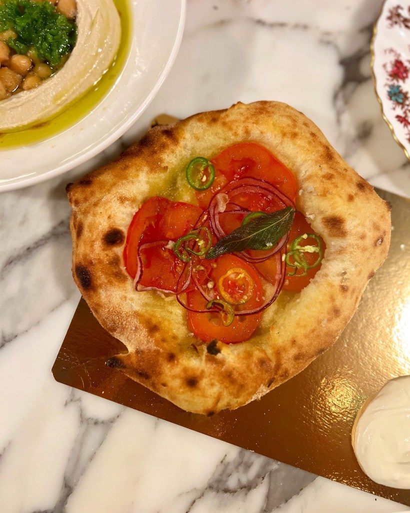 The atmosphere at Lilienblum reflects the laidback cool of a Tel Aviv eatery. Step inside and the first thing you’ll notice is the gentle smell of sage, thanks to leaves pulled from the huge bouquets of herbs dangling over the marble countertop of the open kitchen – home to the best seats (or stools) in the house. Lead by head chef Oren King (whose CV includes Dinner By Heston, Hide and Roka), come here for Eyal-style theatrics. An array of fruit and vegetables adorn the counter organised by colour into a vivid rainbow. It’s details like these – as well as house plants, scattered candles, and tomatoes on the tables (they’re big fans of tomatoes at Lilienblum, as you’ll see from the menu) – that makes what is actually quite a large restaurant feel inviting, intimate and warm. The front of house team are also welcoming and keen to guide diners through the curious and poetic menu.