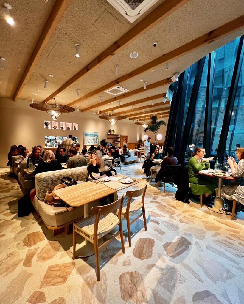 The Aussie vibe is immediately emanated from the décor, which presents Australia as some sort of idyllic dream world. One moment you’re on Greek Street, weaving through the trash, rats and hen parties of Soho before a quick turn into the fresh and pretty Ilona Rose House. Thanks to the Crossrail redevelopment, this spot has seemingly carved out a whole new section out of Soho. Located within a huge courtyard adjacent to Kapara (on which see my review here, Milk Beach feels like a total escape from Soho. The vibe inside is sun-bleached coastal cool — a textured pastel colour-scheme of stone, taupe and beige. This is a spacious oasis. Whilst life in London is cold, relentless and unyielding at present, at Milk Beach things are decidedly vitamin D-drenched and blissful.