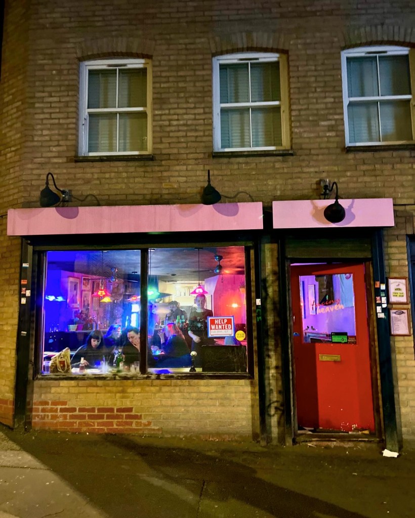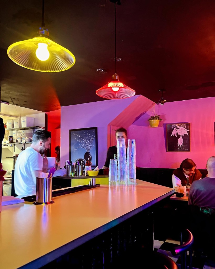 From LA chef Julian Denis comes Facing Heaven, a successor to Hackney-based vegan Chinese Mao Chow. Tucked on a corner around the back of Mare Street, it’s an unassuming, nameless shopfront. Once inside, though, low key it is not. With black-and-white chequerboard flooring and low neon lights reflecting off every surface, this small room serves up a cocktail of Hackney hipster coolness and comfort. Definitely check out the disco tiling in the loo.