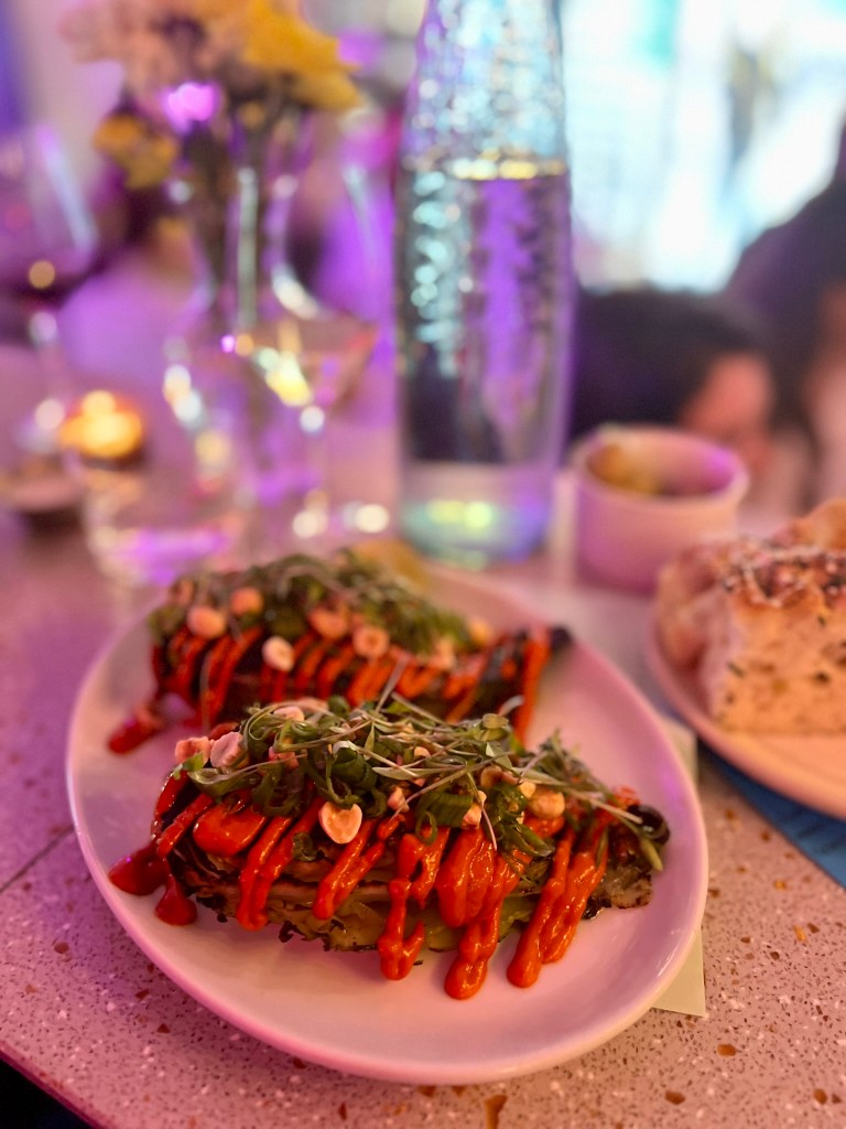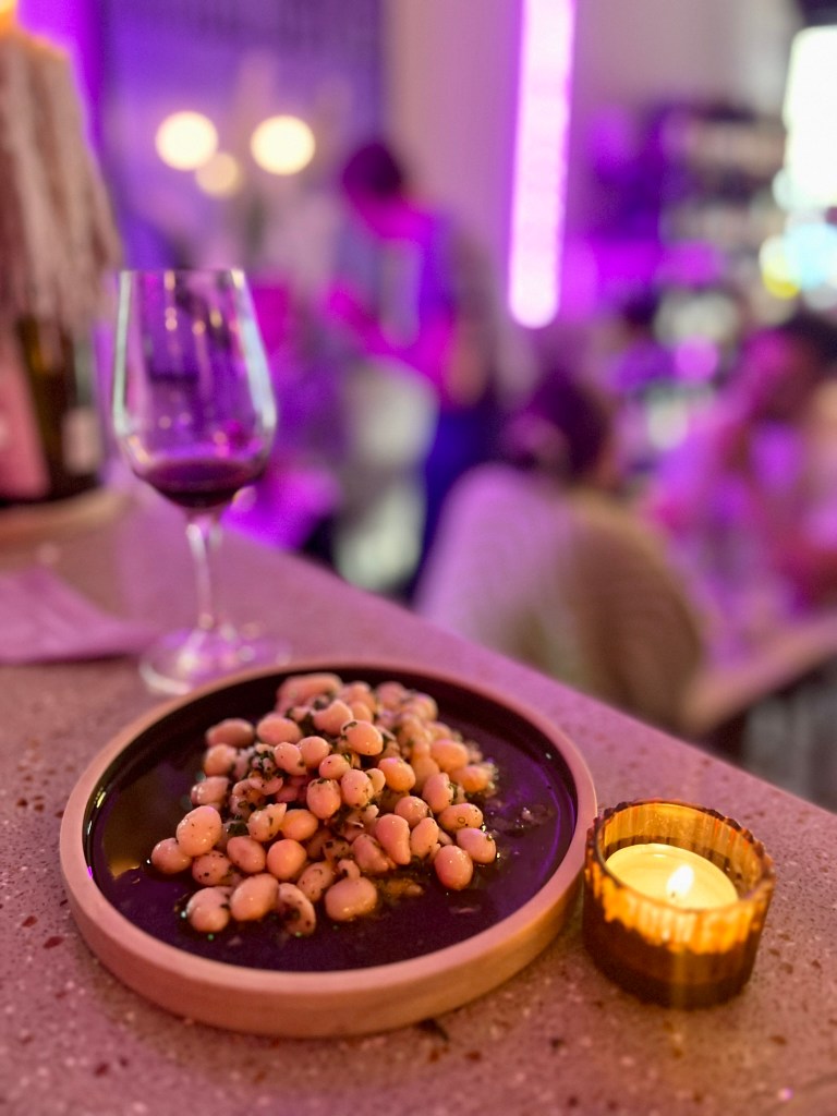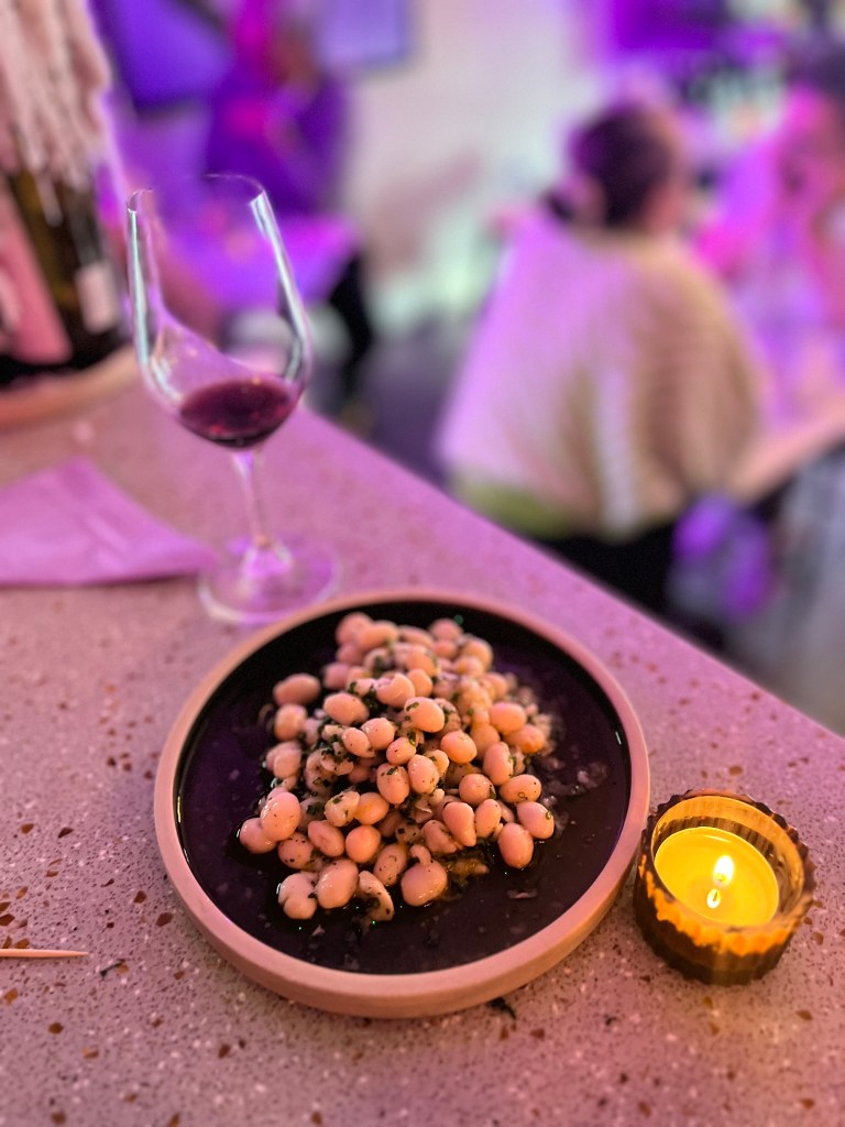 Food-wise, the kitchen kindly accommodated my vegan requests and adapted the dishes as requested with plates arriving in a steady flow. To start, the team kindly sent over a small bowl of super juicy, XL Perello olives (£4) with their herby House focaccia (£4.50). Both are excellent snacks to pick on over sips of dry wine. Salty, moreish and full of flavour.