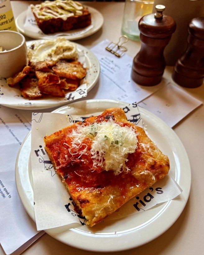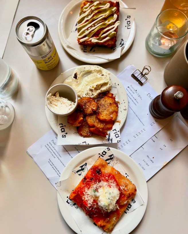 An all-day café come pizza bar, Ria’s has just knotched up the dial on the – already thriving – Notting Hill food scene one step further. Kicking off with coffee and home-baked cookies in the morning, moving to focaccia sandwiches at lunch, and transforming into a natural wine and pizza bar come evening, Ria’s has something to offer anyone at any time of day. There’s a duality in the use of the space that guarantees everyone will experience their ideal moment here. But Ria’s real USP is their deep pan-style Detroit pizza pies made with wildfarmed flour. These can be bought whole (apart from the garlic wild mushroom option) or by the slice. Ideal option for the picky eater: though I’m a fan of pizza, I often get bored after a couple of slices. With a more DIY option on offer here, you can mix and match, and order as you go here, pacing a meal to your own speed.