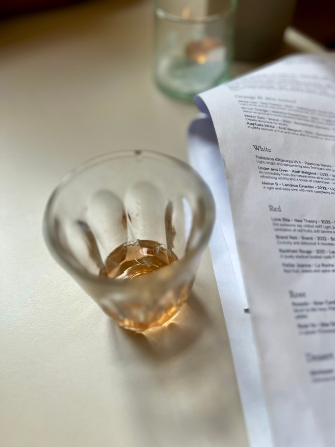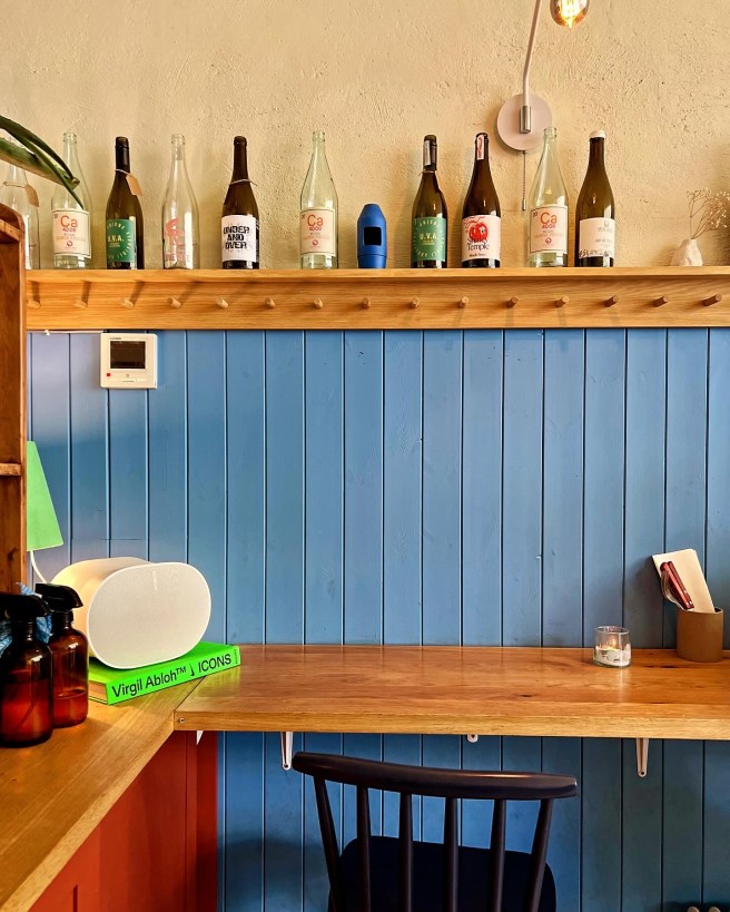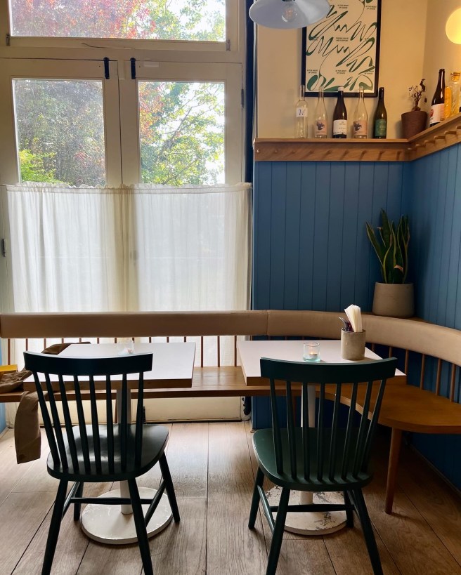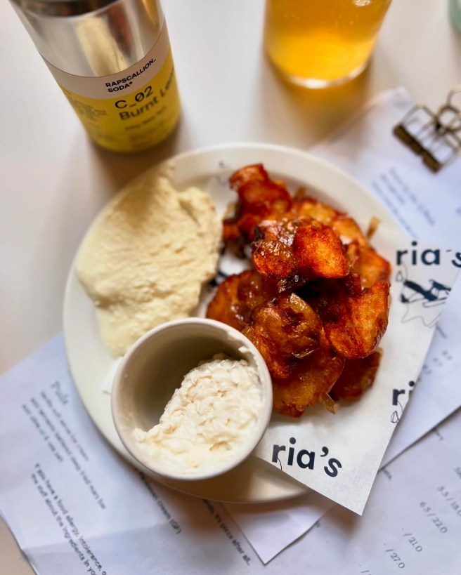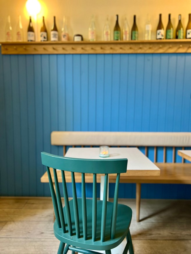 Scottish-born Ria Morgan is behind Ria’s, heading up an all-female team including head of food Mahsa Glazacheva (ex-Dispatch and Allegra). Indeed, on our Sunday evening visit, the diners were mostly groups of girls. It’s a charming setting for a relaxed bite. Quiet chatter fills the small, baby blue interior, as friends lean back on the cushioned oak benches and fill the room with gentle chatter against a soundtrack of soft jazz. A dinner here can’t help but feel intimate – especially alongside a glass of their natural wine. It’s in the nature of the 24-cover room, the dim lighting that’ll make you feel like you’re in the ‘rom’ part of a romcom – also helped by the Notting Hill location, of course, the counter seats that line the restaurant, and the empty wine bottles lining the high shelves.