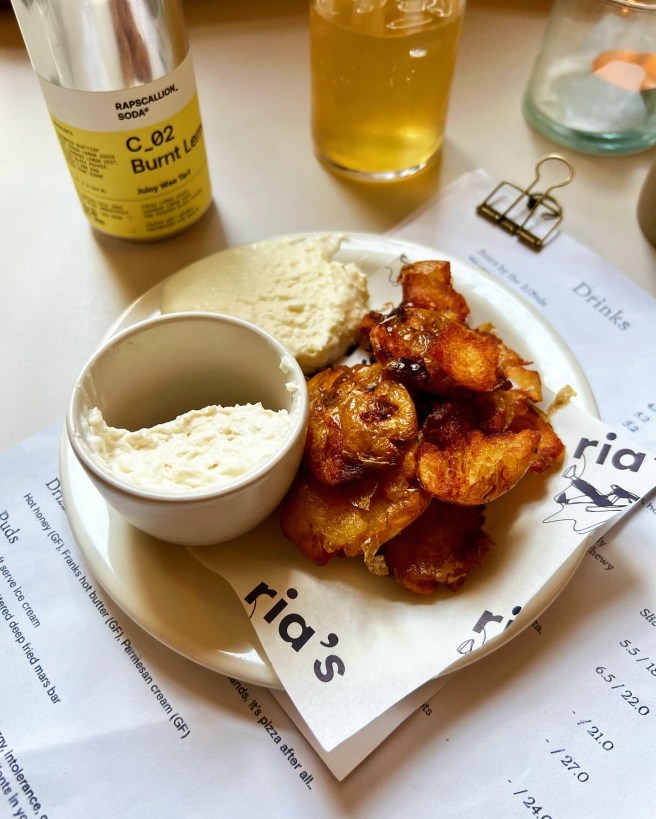 To start, we went for Fried potatoes with garlic infused whipped feta (or stracciatella for the vegan take). These were crispy bites of joy – a preview of the pizza crusts. Like chips, but with a bigger surface area lending for more crispiness and showcasing summer baby potatoes in fully glory.