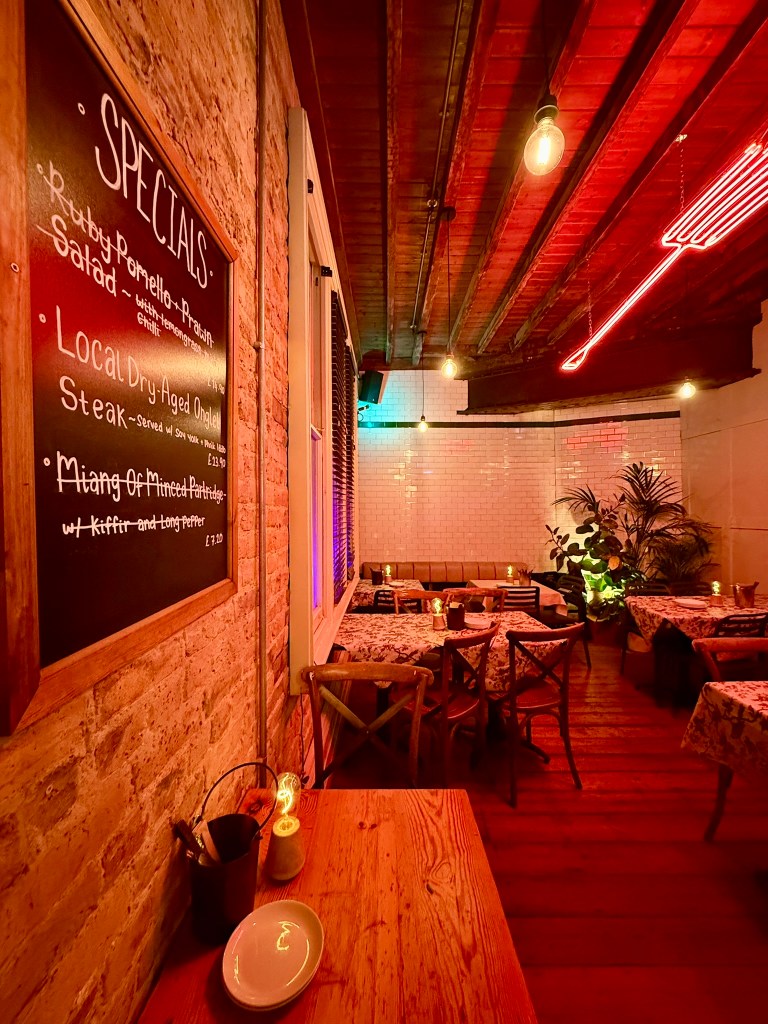 Small, simply decorated and intimate, the focus here is on the roaring open kitchen and a large neon sign on the wall – reminiscent of the Bangkok streets. Casting a pink light over the dining room, this is a cosy, warmy-lit space – ideal for a December evening. The atmosphere is as buzzing as the streets of Chiang Mai – as well as the crowds gathering in the pub below.
