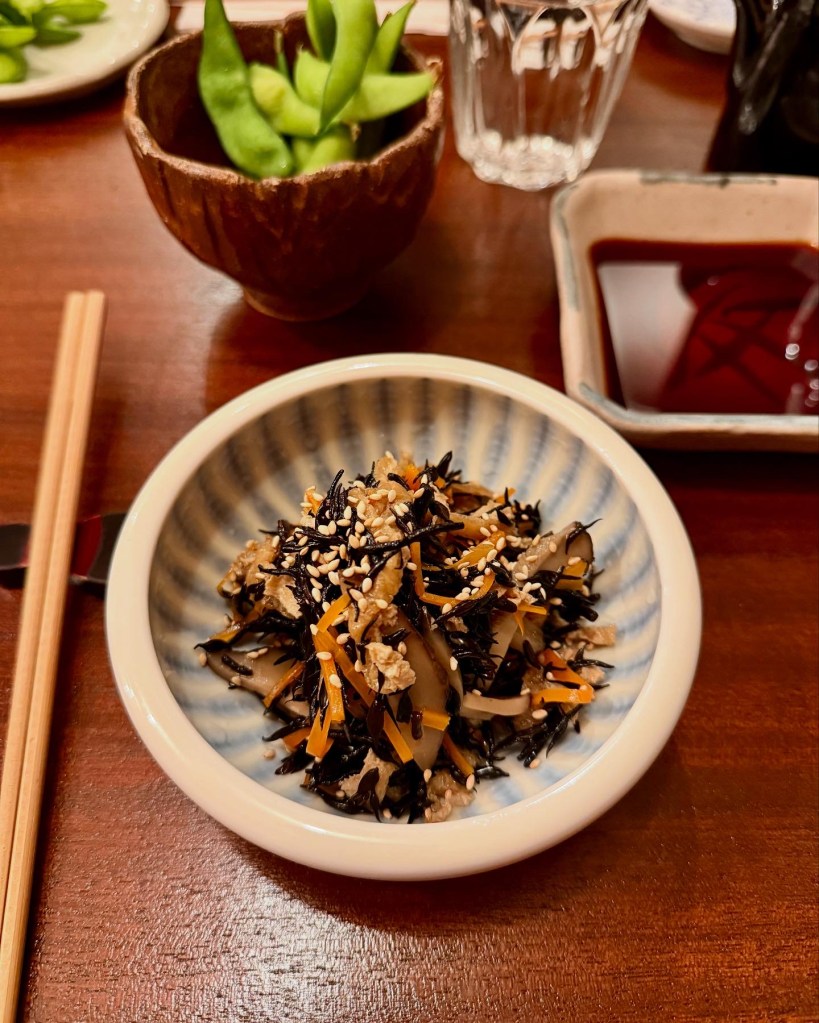 Given that it’s open both day and night and serves everything from nigiri and tonkatsu, to soba and udon, Jin Kichi has something to offer everyone. From a menu of about 100 items (including noodles, rice, simmered and pan-fried dishes), I picked Hijiki (£5.80), cooked black seaweed with vegetables and sesame. This light dish has a refined brilliance: moist tangles of seaweed, with mushrooms dotted here and there, taste like strings of silky goodness.