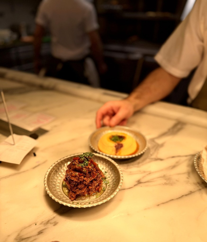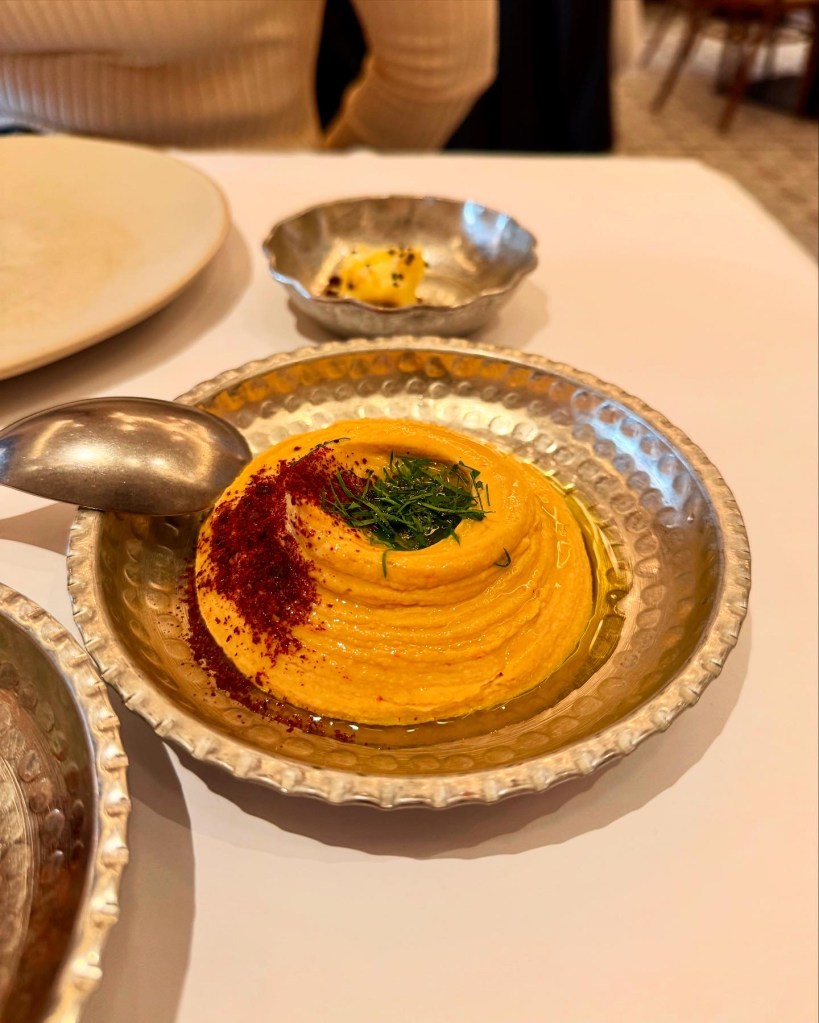 Though branding itself as a Turkish restaurant, the menu takes inspiration from across the Ottoman world. To snack, we went for a couple of mezze: Muhammara (£9), a sweet and nutty sun-dried red pepper and walnut dip, and of course Hummus (£8) finished with chilli powder. Though delicate and glossy-looking, both dips were loaded with flavour – arriving on the table like little pots of paint, ready to dunk the breads into.
