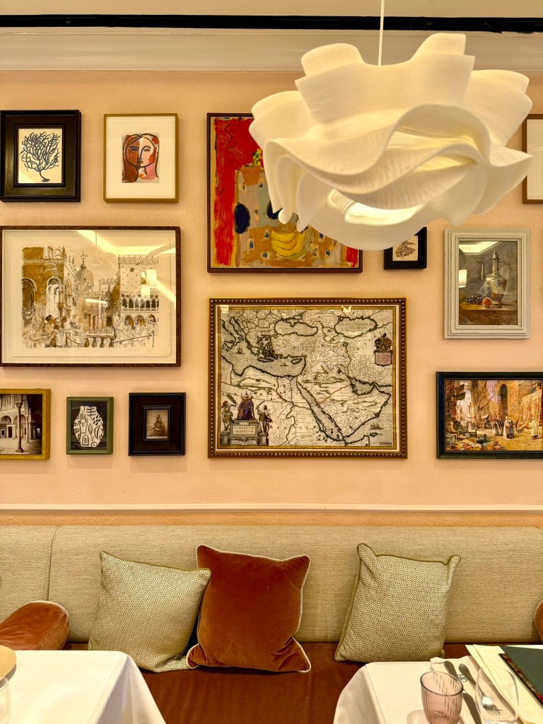 Situated on the ground floor of the smartly refurbished Hyde Hotel, Leydi feels very tucked away. An elegantly bohemian bolthole, it’s decked out in pale pink shades – very appropriate for Spring – nodding to art nouveau. There are Bentwood chairs pulled up to tables with crisp white cloths, beautiful lampshades, a colourful selection of contemporary artwork and Ottoman maps all over the walls, and scalloped archways separating the restaurant into separate, more intimate dining areas. Even the bathrooms are pretty, with zebra-print walls and basins fashioned like cut-crystal punch bowls. Though my favourite part of the restaurant is of course the open kitchen given the excellent views of the real action here.