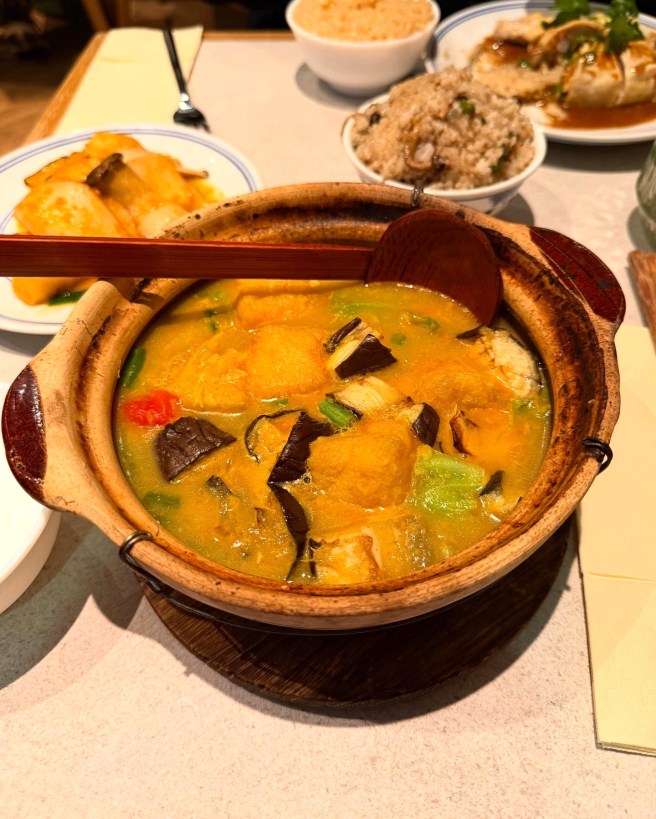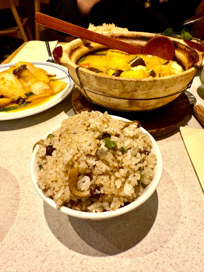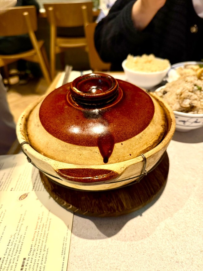 For mains, I went for Vegetable Curry Stew (£16). Served in a steaming hot Vegetable Claypot, this is flavoursome yet light. Sitting in the light curry broth are silky aubergines, more of the wonderful tofu puffs, green beans & cabbages. Simmered in fragrant spices, it’s refreshing – not what you’d expect from a curry and closer to Vietnamese cooking for me. Alongisde was Fermented Mushroom Rice which is a first: sticky mounds of fermented, fungi-studded grains,