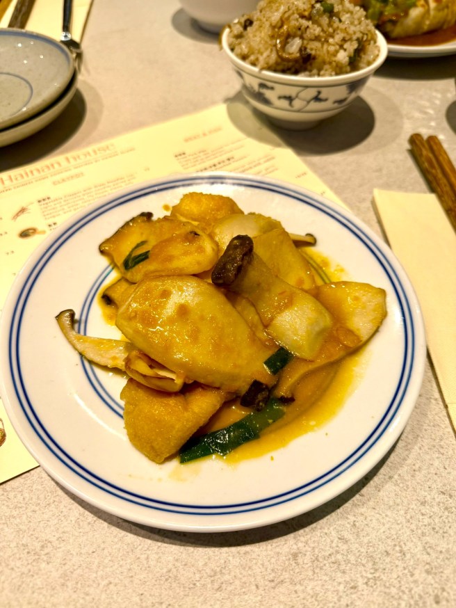 Hainan House is London’s (and possibly the UK’s) only restaurant championing the food of this island, which should be celebrated and appreciated more widely. From the Small Plates, my companion and I shared the Tofu Puffs & King Oyster Mushroom Stir Fry (£7.50). This was an indelicate riot: giant, spongy tofu squares paired with delicate oyster mushrooms, both anointed with the spicy Yellow Chilli Sauce. Incredibly vibrant.