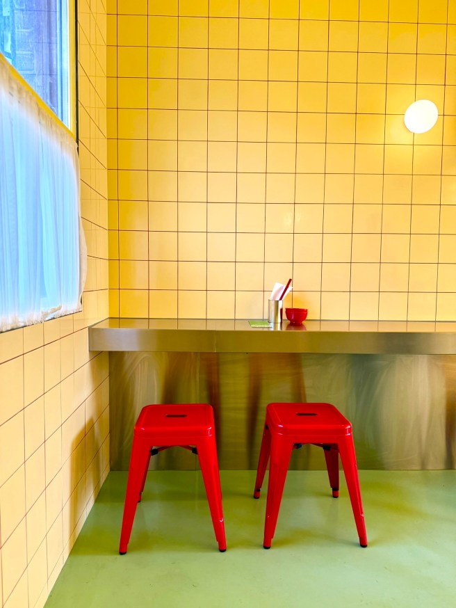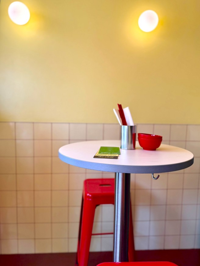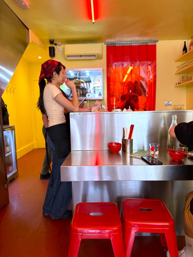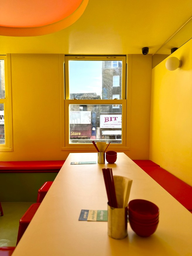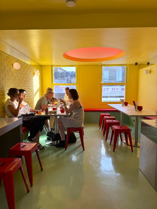 Situated on Rye Lane — a world of street barbecues and money transfer shops, of Caribbean grocery stores and mobile repair booths — Lai Rai stands out, crisp and neat. Inside the décor pays homage to retro Vietnamese canteens and features motifs drawn from utilitarian cafes across the country. A buttery yellow colour palette is accented with the red of 1950s diners and shiny textures all over – the pin-thin neon strip lights; the metal stools; the chopsticks; the red sharing bowls.
