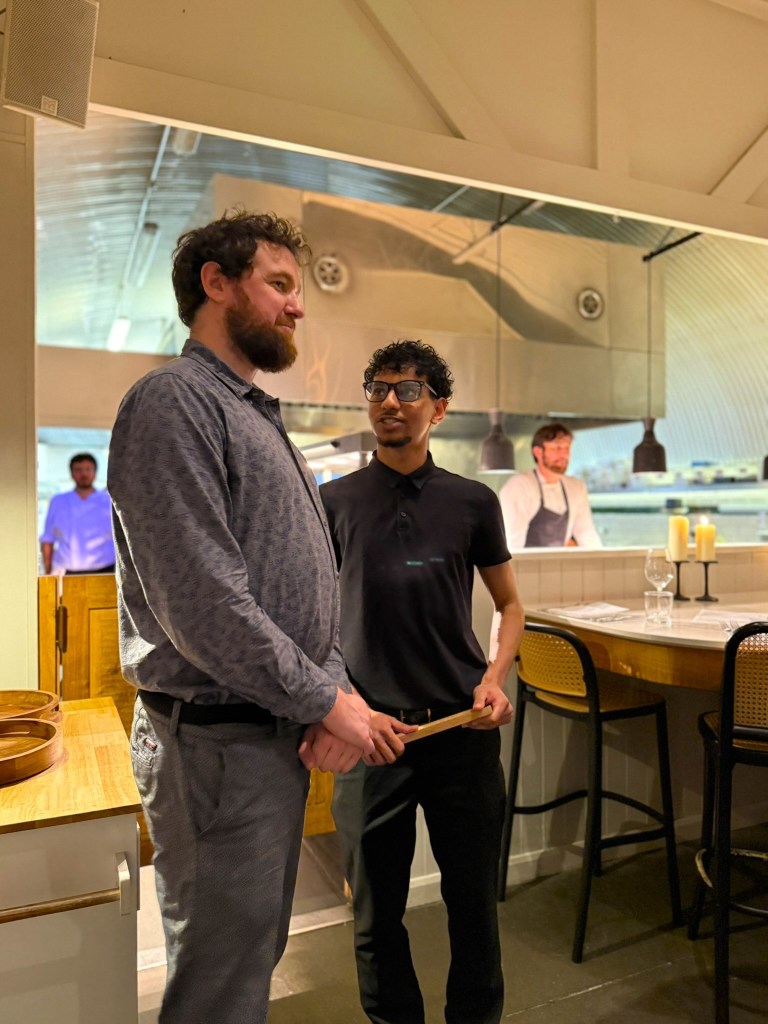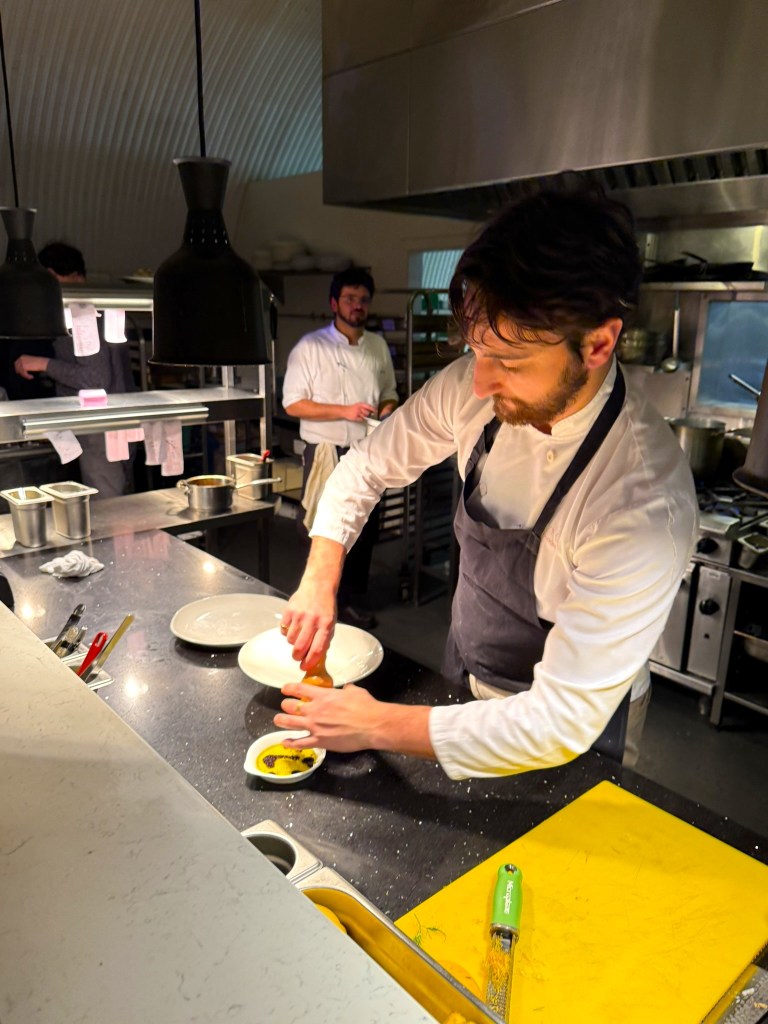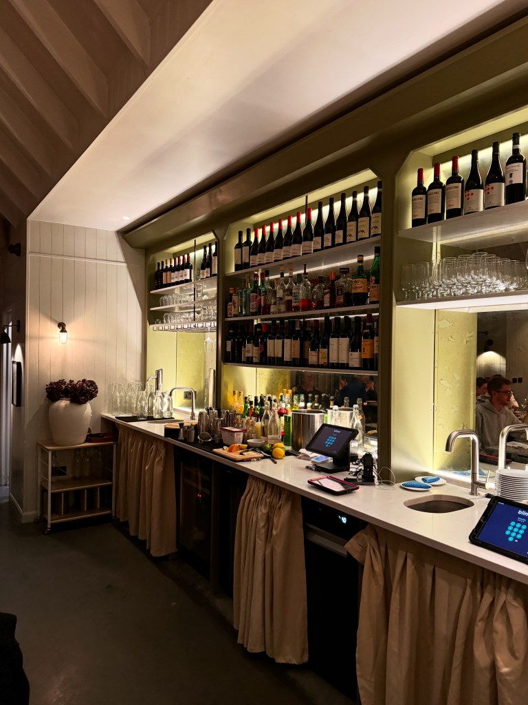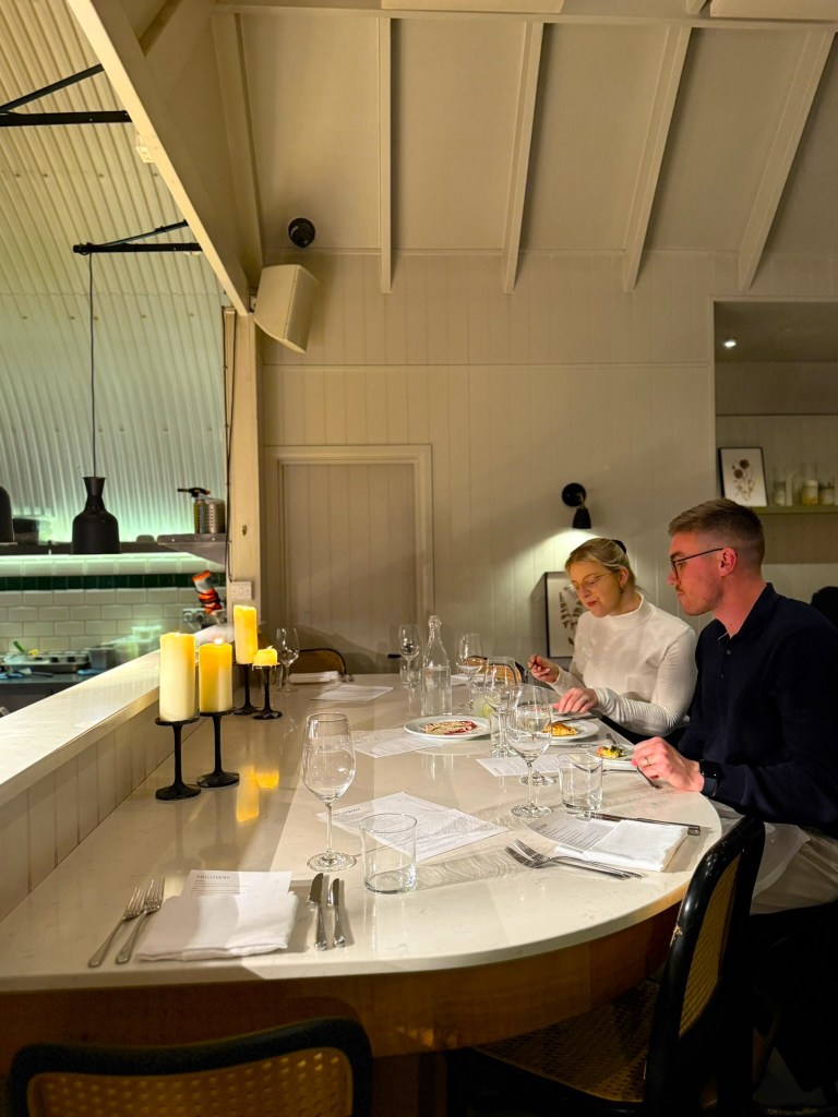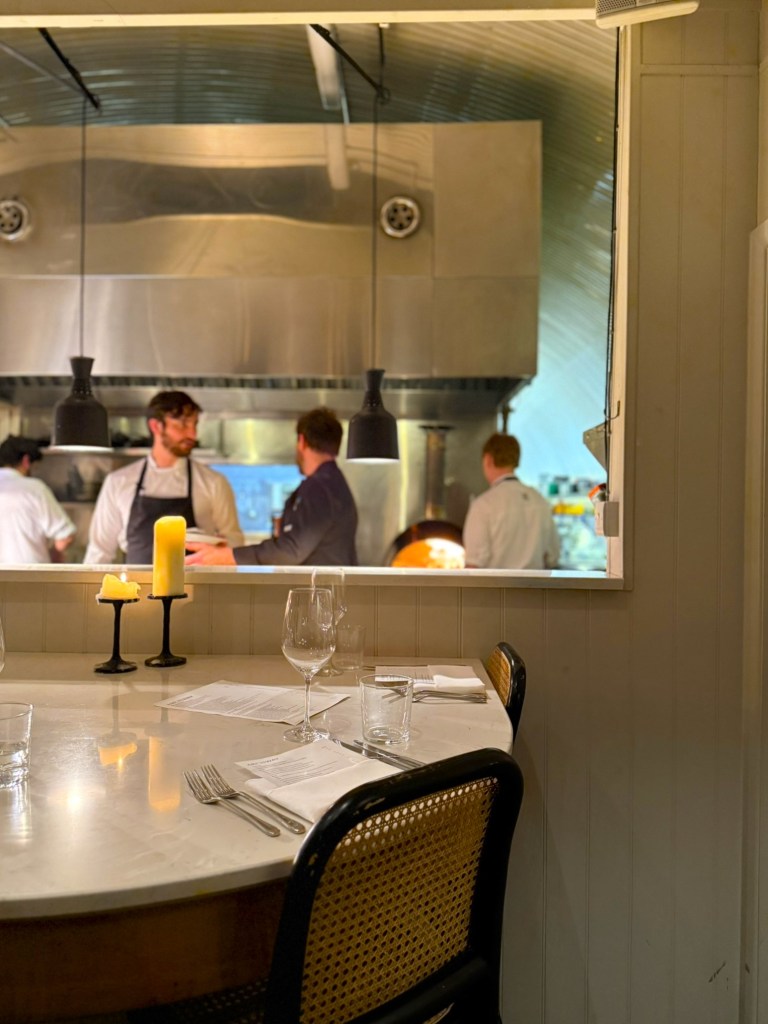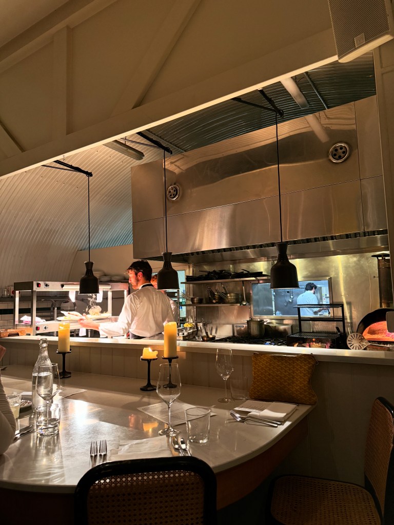 The room is light, airy and unpretentious and interiors are simple, stunning and classic: gorgeous ivory panelled beams, drippy tapered candles, marble surfaces, and bright woodwork reaching up to the ceiling. Like most establishments, the best dining spot is to be found at the kitchen counter.